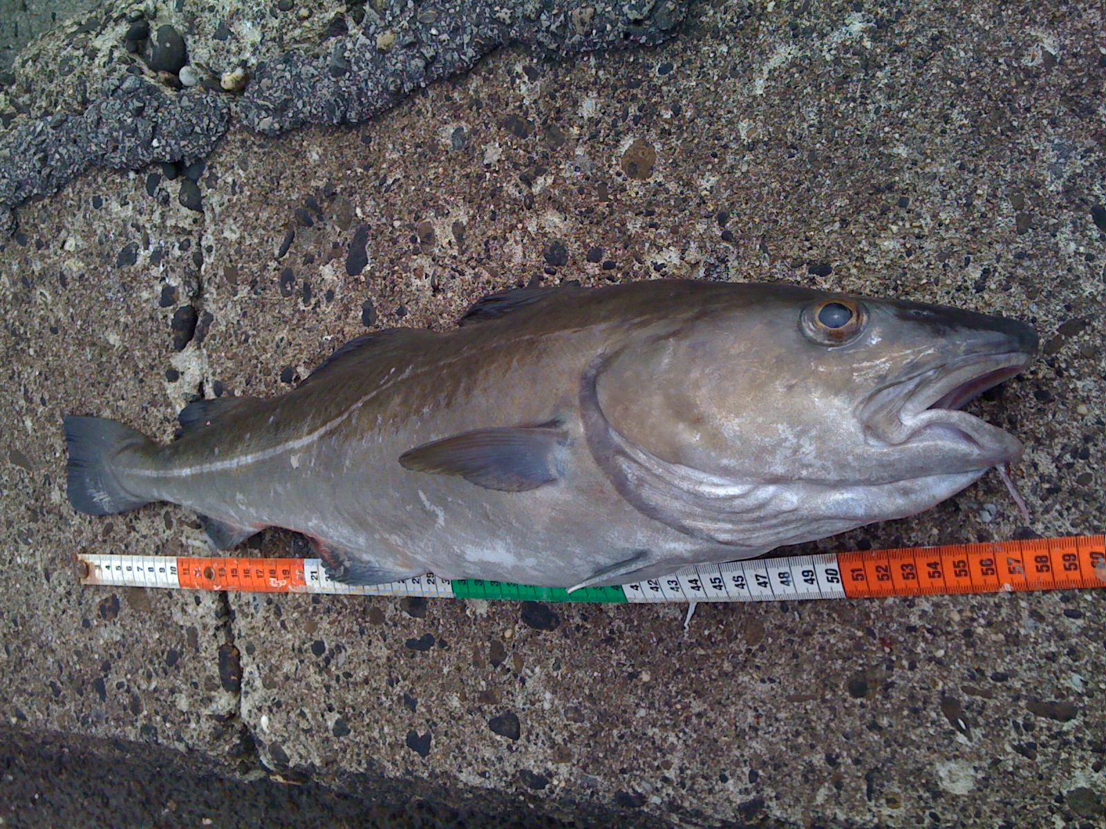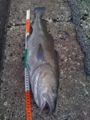 Toen werd het tijd om de strandhengel op te tuigen en een paar mesheften tussen de stenen te presenteren -het was een uurtje voor hoogwater-. Op de derde worp volgden voorzichtige trillinkjes op de top. Draaien ging zwaar, maar geen vastloper. Op de kant kwam een prachtige gul, ruim 59 centimeter, een aanscherping van m’n pr (was 56 centimeter). De dag kon al niet meer stuk.