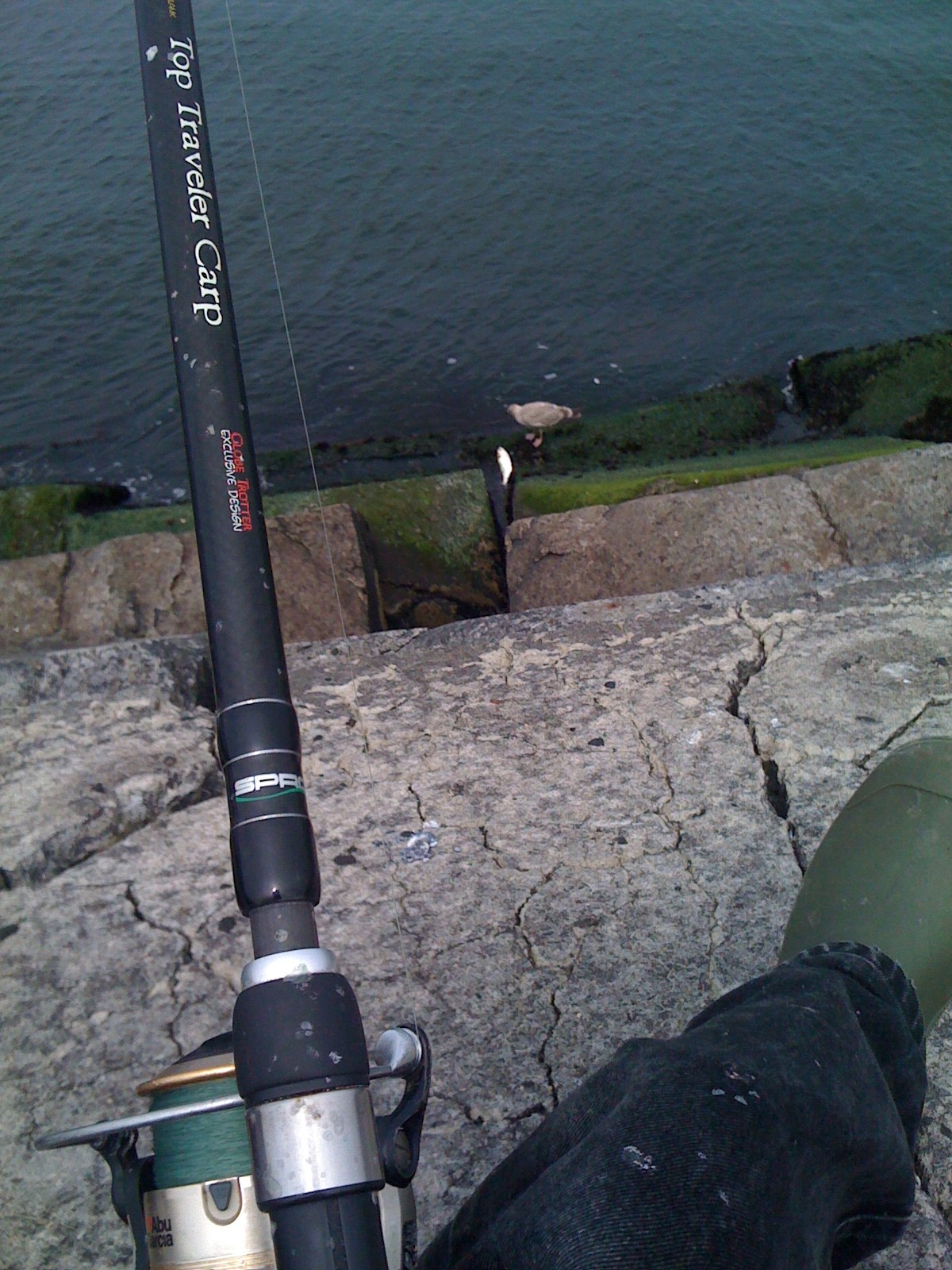 Na de eerste worp lag er binnen vijf minuten een makreel op de kant, dat begon goed, dus. Even daarna een mooie geep. Een kort actief intermezzootje werd veroorzaakt door een jonge meeuw, die m’n dobber wilde opeten (natuurlijk, een keihard, oranje ding is eetbaar…), ik trok de zaak weg van ‘m. Helaas bleef het haakje 6 in een van z’n teentjes hangen. Flapperend, maar niet echt tegenwerkend liet het beestje zich binnenhalen. Voorzichtig opgehesen aan de lijn, tot ik bij het haakje kon. Gelukkig bleef-ie op z’n rug liggen en kon ik het haakje makkelijk loskrijgen. Hij/zij vloog goed weg, ik hoop dat ie wat heeft geleerd.