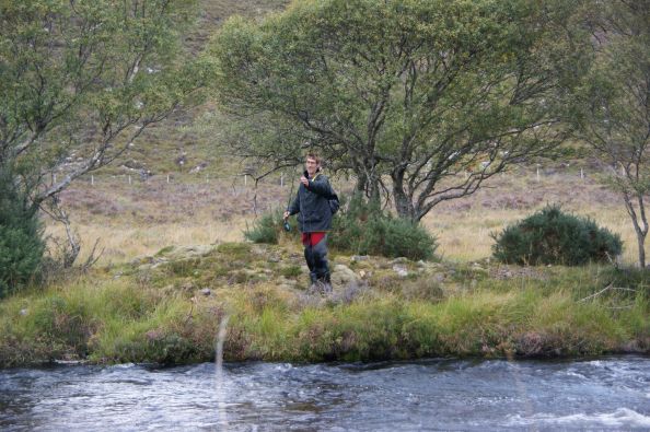 In zoet water eet de zalm niet en trekt de rivier op van poel naar poel, ligt daar wat, spring daar wat en is alleen maar door ‘m te irriteren te verleiden tot een aanbeet, aldaar meest een garnaal-imitatie. Omdat mijn techniek nog niet ‘je-dat’ is waren de complicerende factoren voor mij de wind, de boompjes, gladde stenen, heel lang gras. Doorzetten dus.