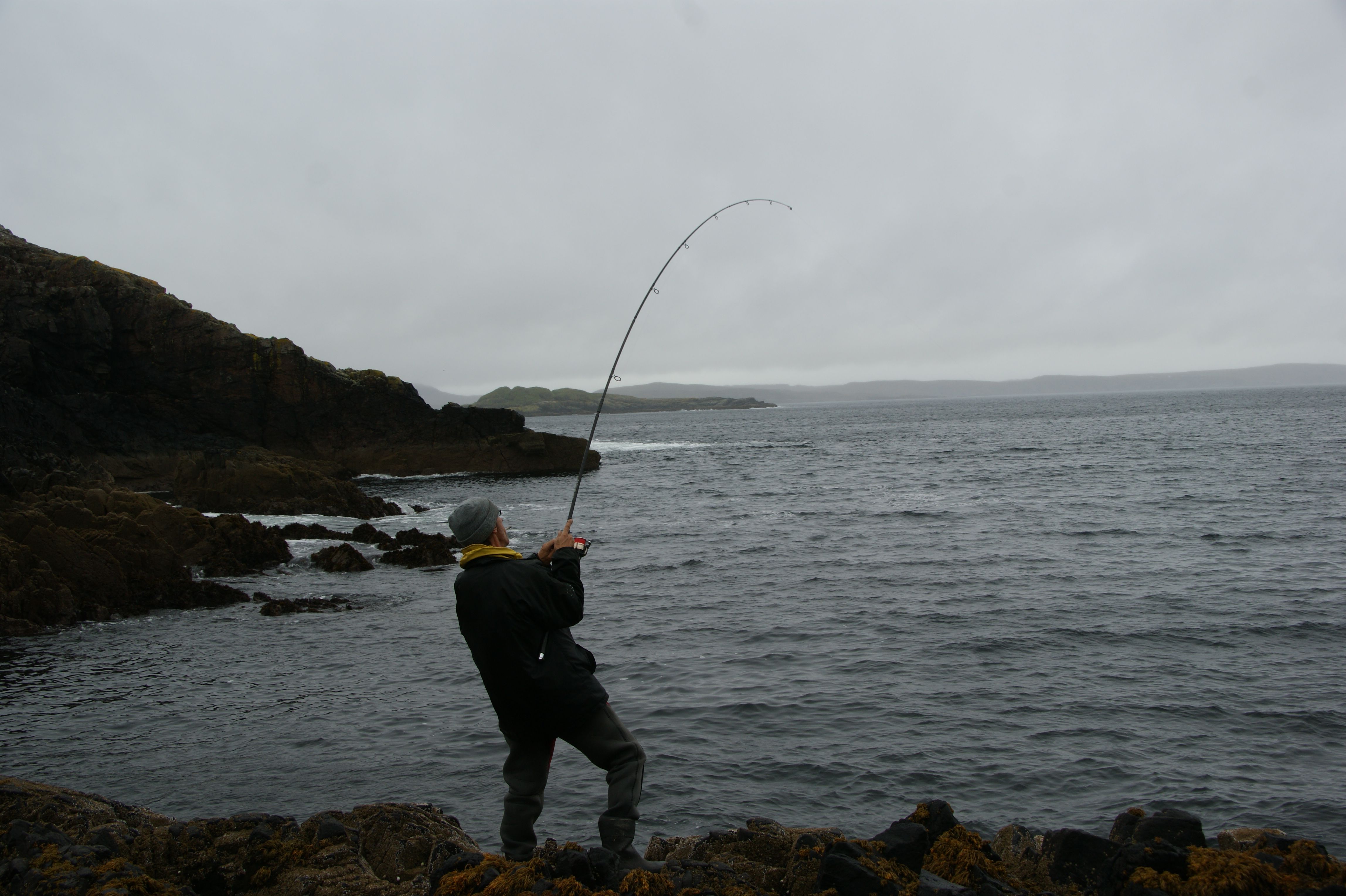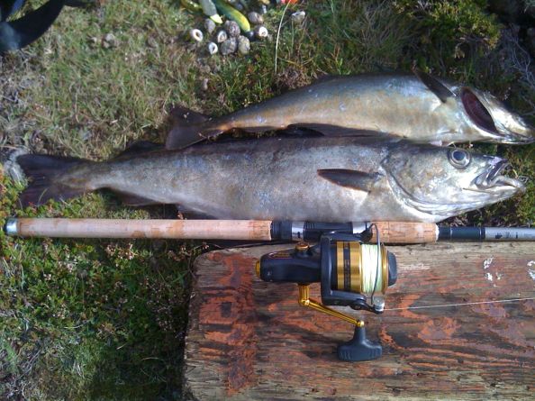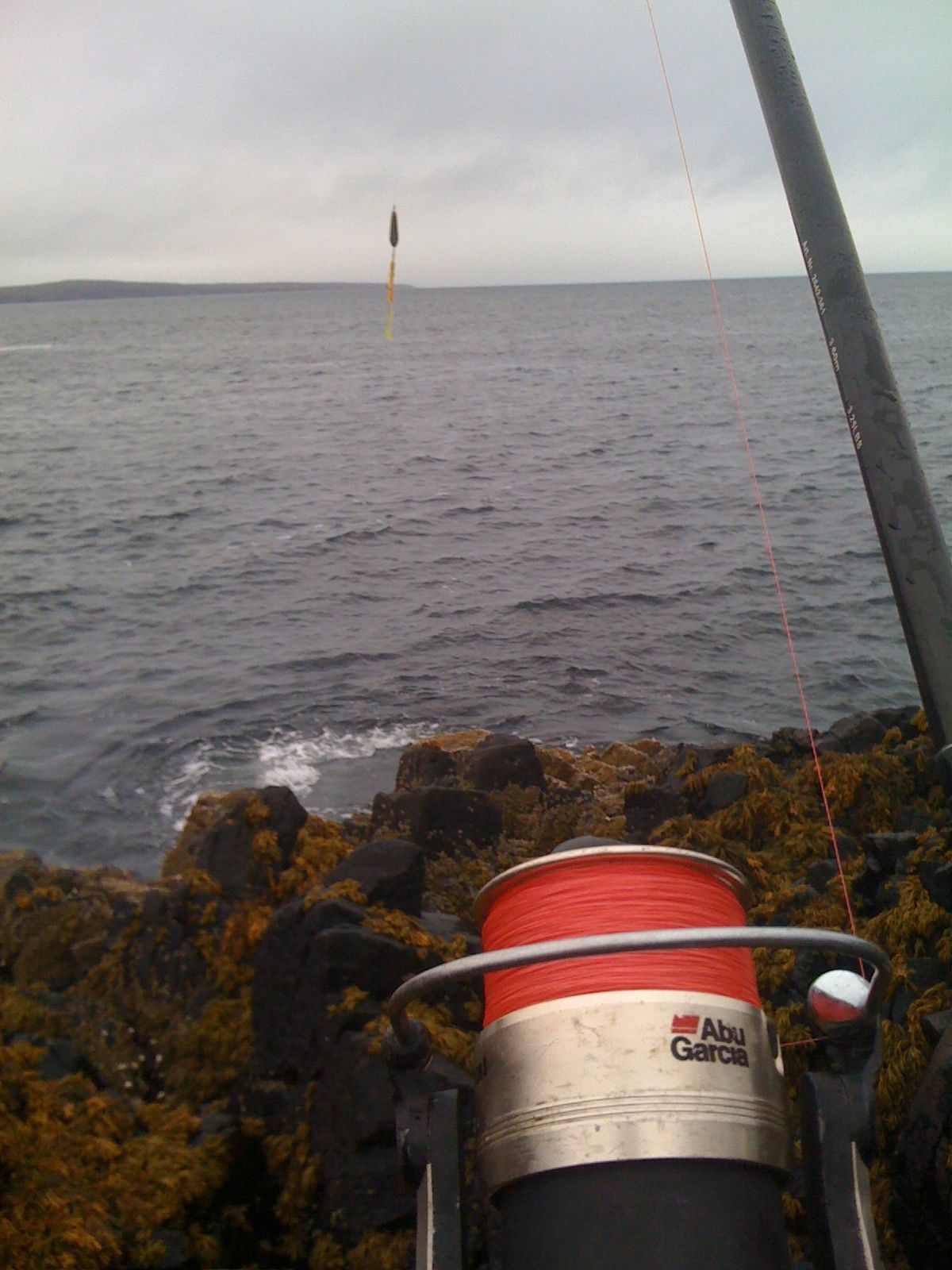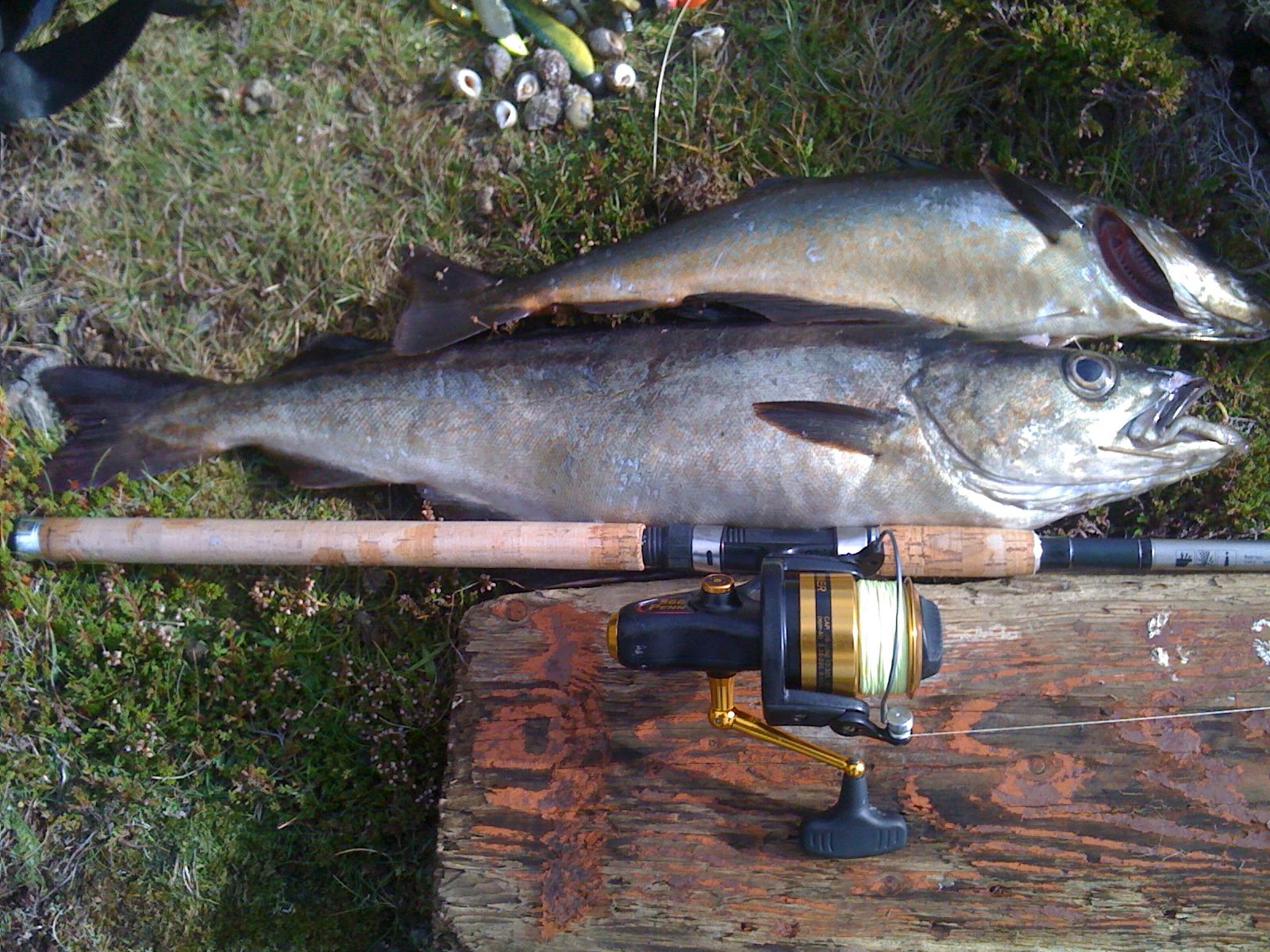 De andere helft van de vistijd werd dus besteed aan pollak- en makreel-vissen vanaf diverse kanten van een rotspartij: een stek richting open zee en een stek in een rustige baai. De binnenkant leverde makreel aan een verenpaternostertje en meest kleine (soms kelpkleurige) pollak op aan een pilkertje. Aan de zeekant kwamen we de grotere pollakken tegen.