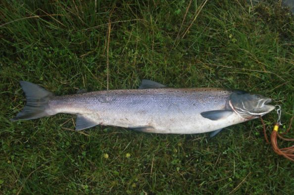 De grootste zalm, ik meen tien pond, begint naar de kant te komen…