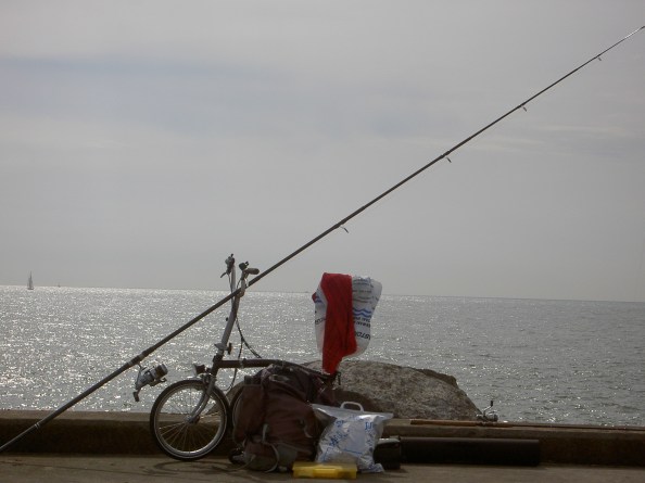Ik ben trouwens begonnen met één hengel dichtbij voor een gul, één haak met vier pieren, als gewicht een zelfgegoten cementen blokje. Ik heb er vier verspeeld (gewichtjes, geen aanbeet gehad) en ben met die hengel ook op afstand gaan vissen. Qua stroming was het goed te doen en bovendien was het rustig bij mij in de buurt. Een stuk verderop voorbij de bocht stond een flink aantal gulvissers.