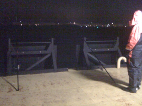 We gingen op de Papagaaienbek kijken. Wind redelijk in de rug daar. Een praatje met twee vissers leerde dat er ook hier vooral klein spul gevangen wordt, vooral wijting. Eelco had nog een andere stek in gedachten en die werd het, aan de Yangtzehaven. Windje in de rug, verlichting ter plaatse en zelfs beschutting. Preciezer kan ik niet zijn, behalve een plaatje.