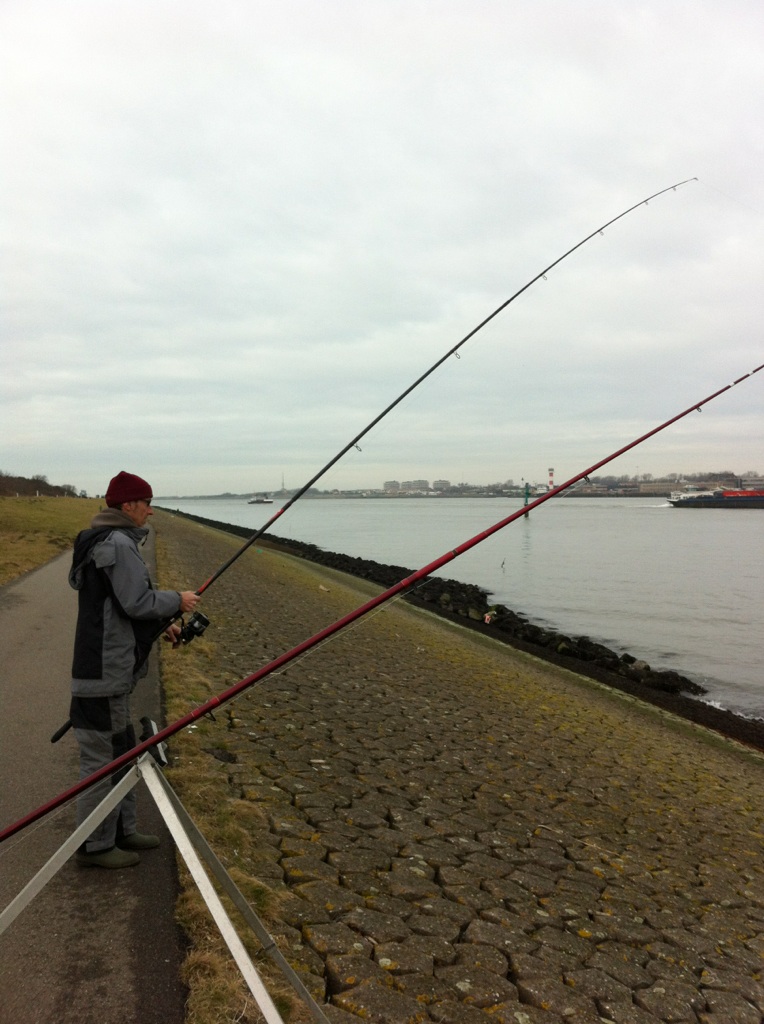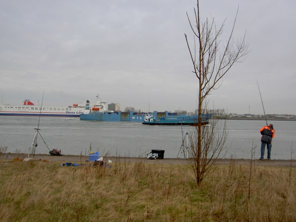 Het plan was eigenlijk dat Eelco en ik een dagje gingen wrakvissen, maar dat ging wegens het weer niet door. In de Europoort kun je altijd wel ergens vissen. Het goede tij viel mooi, hoogwater rond 16.00. Rond 12.00 gooiden we voor het eerst ons loodje in de Waterweg op een stek op de landtong, tegenover de Stena Line. Met hoop op een mooie gul.