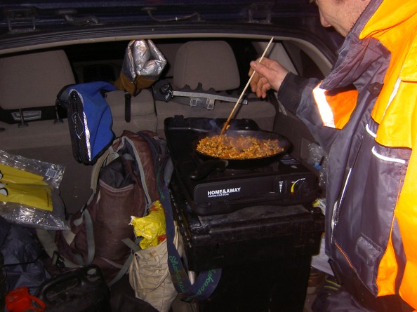 Die beschutting kwam goed uit want in de loop van de avond kwam er een enorme mist langswaaien: koud en vochtig. Maar eerst effe de macaroni opwarmen!