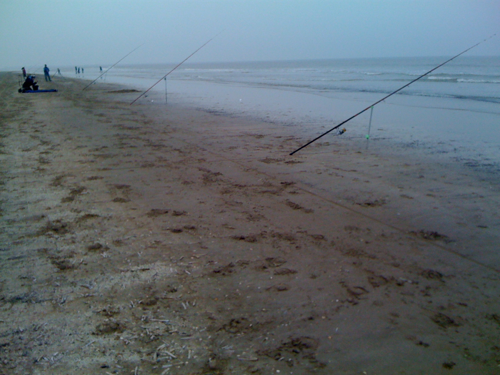 De ontknoping van deze competitie vond plaats op het strand van Wijk aan Zee. De wedstrijd was van 9.30 tot 13.30, hoogwater viel rond 11.30. Ik had vandaag niet veel vertrouwen in een goede vangst. Ondiep, oostenwind dus geen branding en koud water. Een enkel botje en de winnaar vangt er misschien wel twee, zoiets verwachtte ik. Zes deelnemers traden aan. Organisator Edo moest zich op het laatste moment afmelden, maar verscheen twee uur later toch op het strand om nog even mee te vissen, een echte bikkel dus. Ik zou een stukkie met Edo meerijden, hij had geregeld dat John dat me effe van station Beverwijk kwam oppikken, top en nog bedankt!