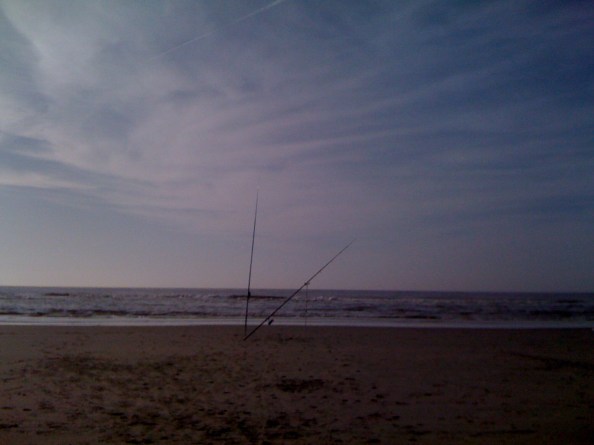 Ook daar kwam ik met twee hengels (de feeder voor de bank en de pook achter de bank) niet van de nul af, terwijl Gert nog een dikke bot erbij ving. Tsja. Het water zou snel opkomen, we wisten het. Dat laatste sjekkie hadden we niet moeten roken. Mijn keurig klaargelegde foudraal, wachtend op de laatste hengel, werd nog even overspoeld door een vloedgolf, alles nat en onder het zand, jammerrrr…. Dat was eigenlijk het leermomentje van de dag.