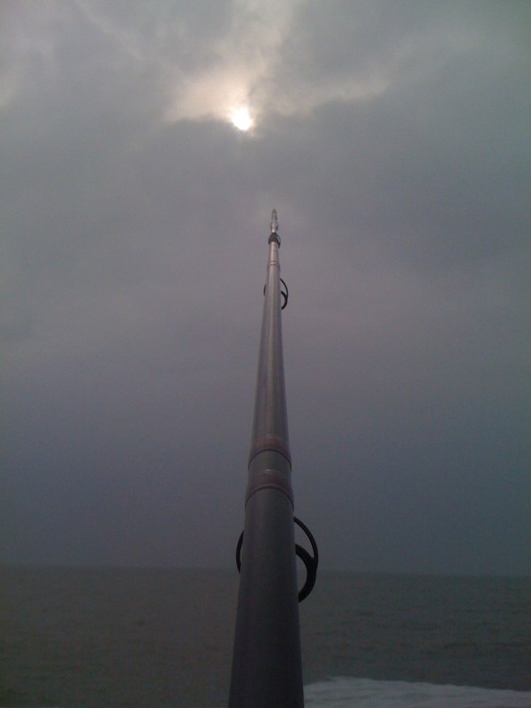 Ik sloot als achterste aan in een rij van een man of acht voorbij de bocht, het was rond 12.00, kentering naar afgaand. 5 Meter forcemaster, 45/00 nylon, cementen gewichtje aan 30/00 nylon, geknoopt aan een lus, een meter van het eind. Aan het eind van de hoofdlijn de haak, ik gebruik tandemmontage. Simpel, goedkoop en effectief voor deze visserij. Er wordt immers tot 30 meter uit de kant gevist.