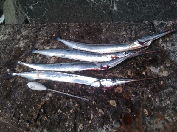 De eerste worp, met een stripje zalmhuid, leverde gelijk actie op. Een geep sprong over de bombetta, een kolkje en daarna foetsie. En dat gebeurde bij de tweede en derde worp ook. Overgeschakeld naar een stripje geep uit de vriezer. Dat bleek wel succesvol. Zachter aas deed ’t vandaag beter dan taai aas. De gepen bleven regelmatig over de bombetta springen, dus ze zaten er wel. Ik viste van 12.30 tot 16.00 (over hoogwater heen) en de vissen kwamen verspreid over de hele periode. In de bocht stond ook Pier uit Zwolle te vissen, zowel aan de binnenkant als aan de buitenkant. Pier ving wat gulletjes tussen de stenen en tegen m’n vertrek kwam de platvis op afstand los. Ook nog even met wat zagers tussen de blokken aan de buitenkant gepeuterd om m’n nieuwe onderwaterdobber-systeem uit te proberen. Geen vis, maar het leek wel te doen wat m’n bedoeling was. Alleen……als je een kwartier gaat staan babbelen met je buurman, kun je er van uit gaan dat het zaakje ergens ingewaaid zou zijn. Dat klopte ook, dus dit ‘prototype’ ben ik kwijt. Binnenkort meer.