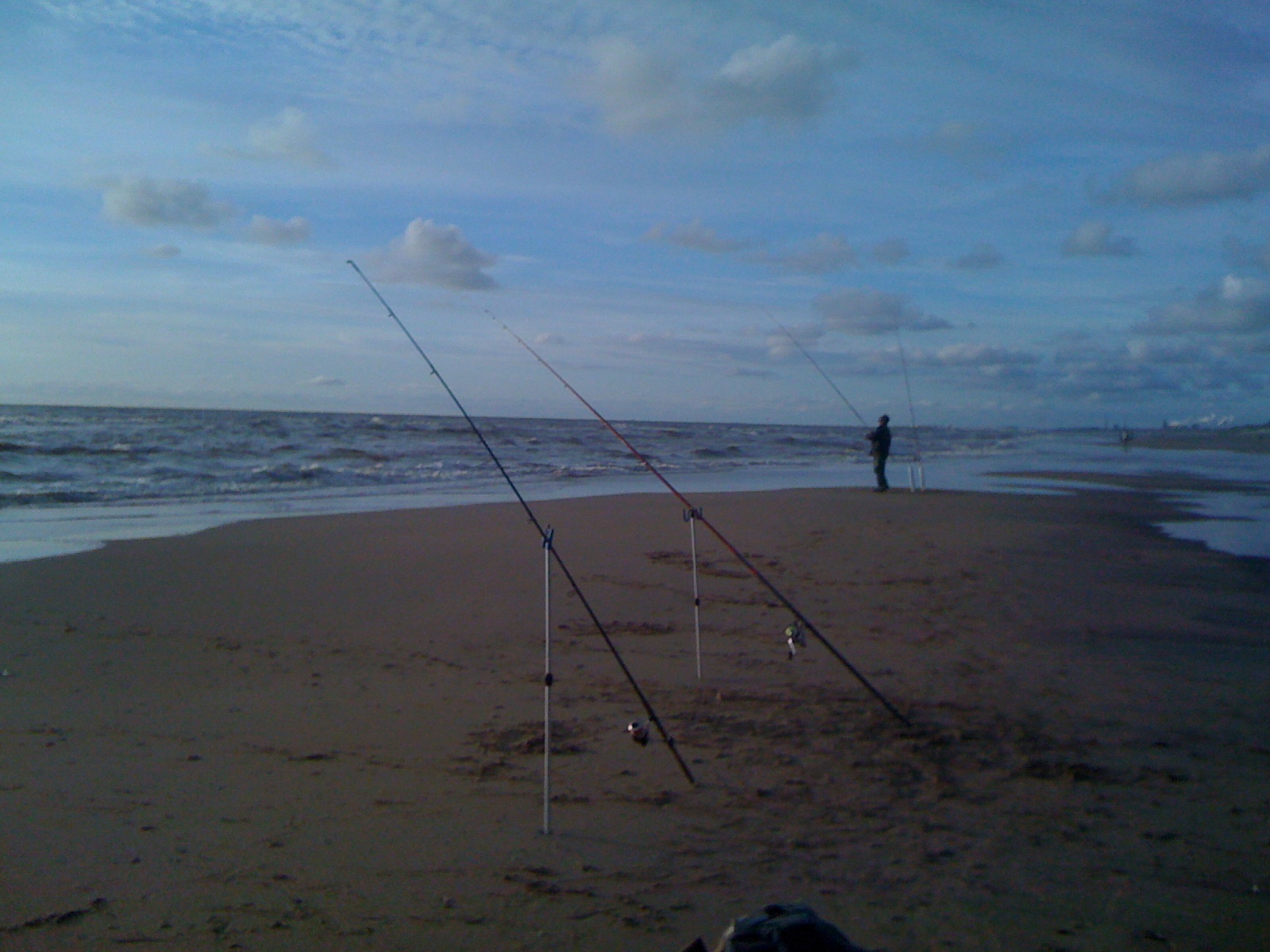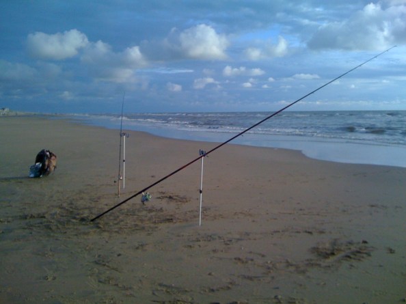 Allebei twee hengels, zagers en mesheften was het aas. Nicolas viste met een wapperlijn en een twee-haaks-paternoster aan strandhengels. Ik met een wapperlijn aan een strandhengel en een wapperlijn aan een spinhengel. Er was weinig stroming zodat 180 gram piramidelood goed bleef liggen. Met de spinhengel viste ik dicht onder de kant met een 50 grams loodje. En dat bleef eigenlijk ook best goed liggen.