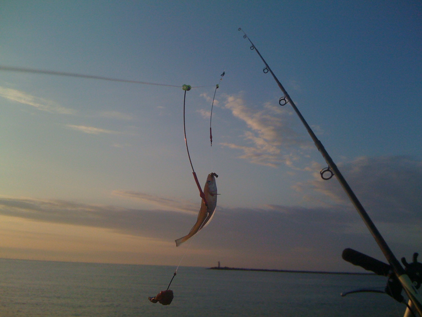 Makreel en tong, dat was het plannetje voor deze zondag. Weinig wind, zonnetje, lekker temperatuurtje, ik had er zin in. Begonnen rond een uurtje of vier in de bocht en gestopt om 21.30 op de tweede stek een stuk terug. Er waren niet veel vissers in de buurt en er werd niets gevangen. De eerste makreel kwam bij mij ook pas na een klein uurtje aan de bombetta. De tweede pas een uurtje later. Ik had intussen de strandhengel voorzien van een paternoster met een drijver, twee haken met een reepje vis. Wellicht zou dat nog een extra makreeltje opleveren. De volgende vis was een flinke 40+ fint. Helaas zat de haak in een kieuwboog….Een tweede tegenslagje volgde: ik gooide de dobber eraf. Niet goed opgelet tijdens een babbeltje met een wandelaar, waardoor de haak achter de strandhengel bleef hangen en pang!…. de bombetta ging richting de noordpier, maar ik had de haaklijn nog. Maar weer ’s gekozen voor de traditionele geepdobber, ietsje luier vissen. Na een half uurtje tevergeefs dobberen, heb ik het zaakje ingepakt en ben een stuk terug gaan zitten. Een driehaaks paternoster aan de strandhengel en zagertjes, hopen op een tongetje. Aangezien deze stok ook roerloos bleef, kon ik ook weer met de dobber aan de gang. UIteindelijk kwam er een makreel bij, gevangen aan de buitenkant. Kort daarna gooide ik deze dobber er ook af, wéér een breuk in de hoofdlijn. Inpakken dus en snel deze lijn vervangen! Behalve een ieniemini-wijting aan de binnenkant is er verder niets meer boven water gekomen. Om half tien waren de zagers op en mijn visdrang voor de dag ook. Lekker gevist met een weinig indrukwekkende vangst.