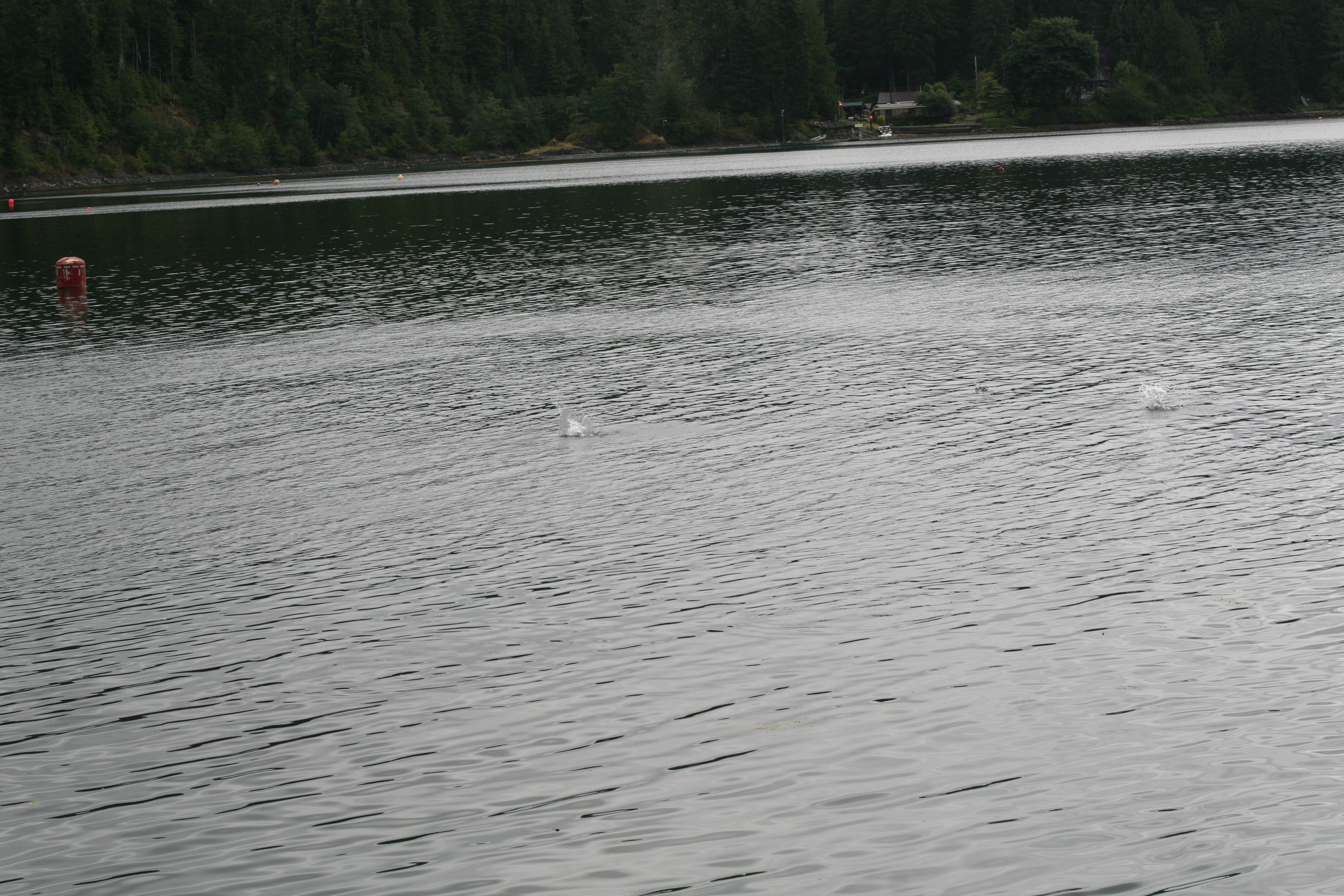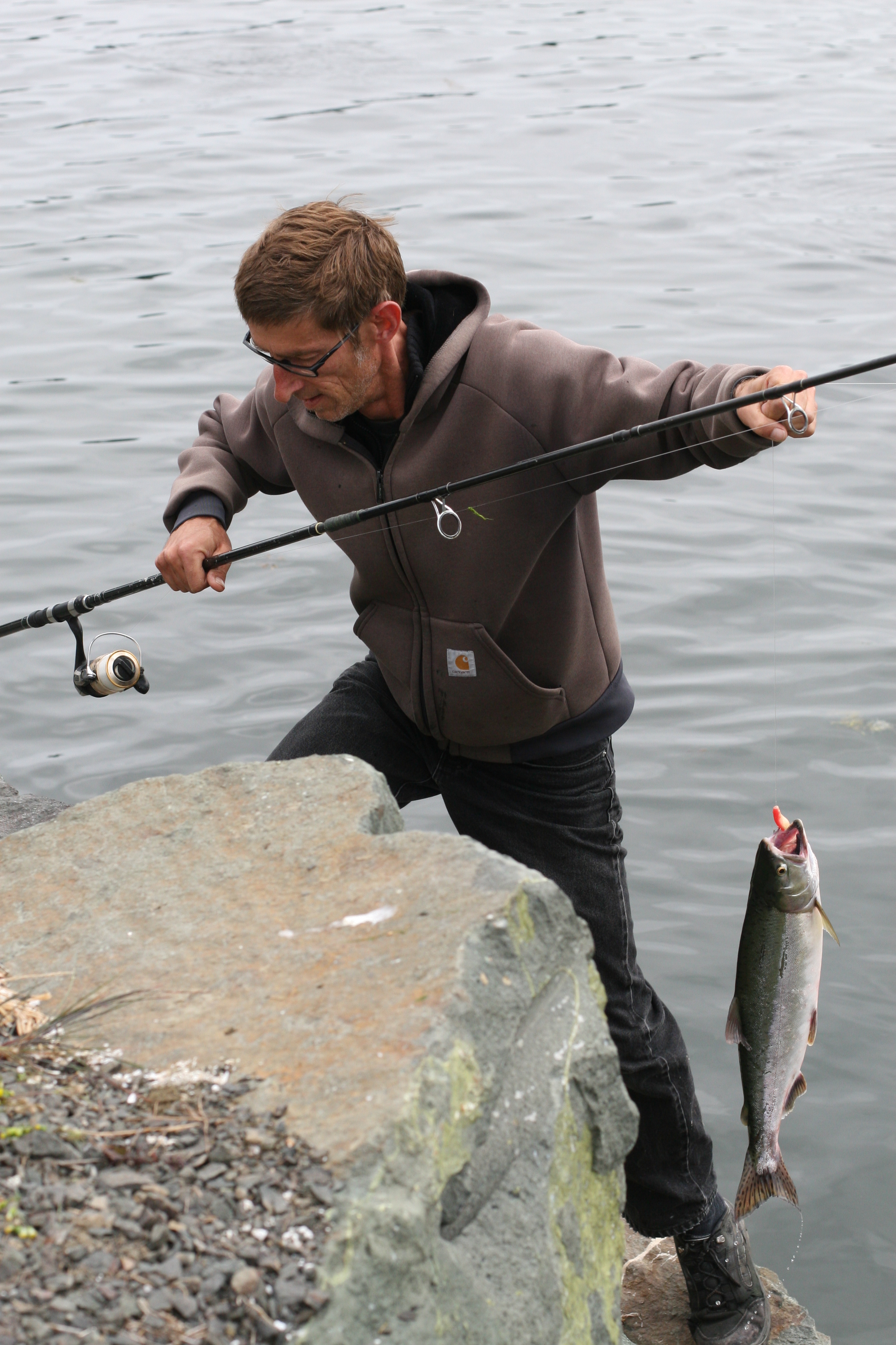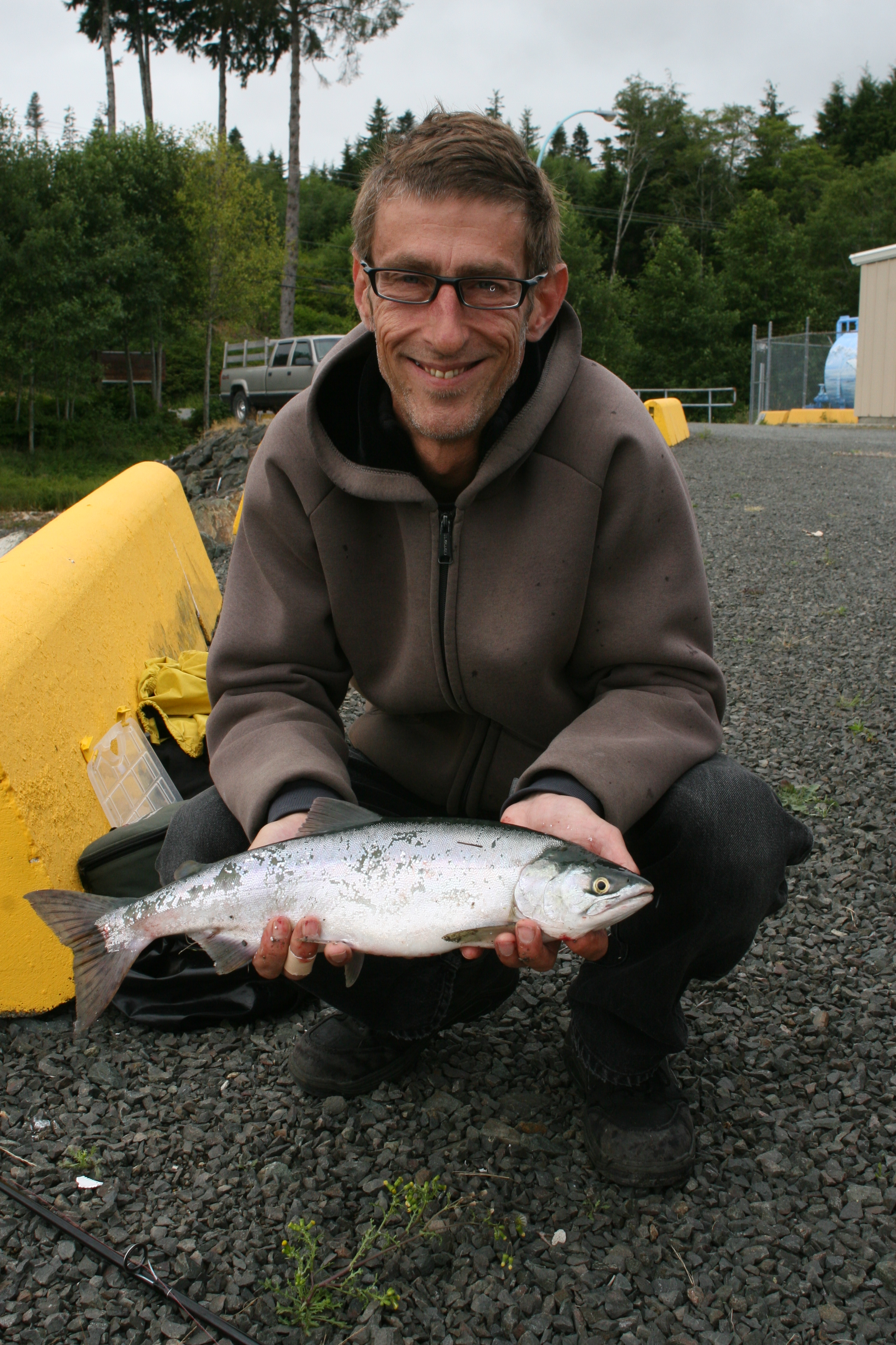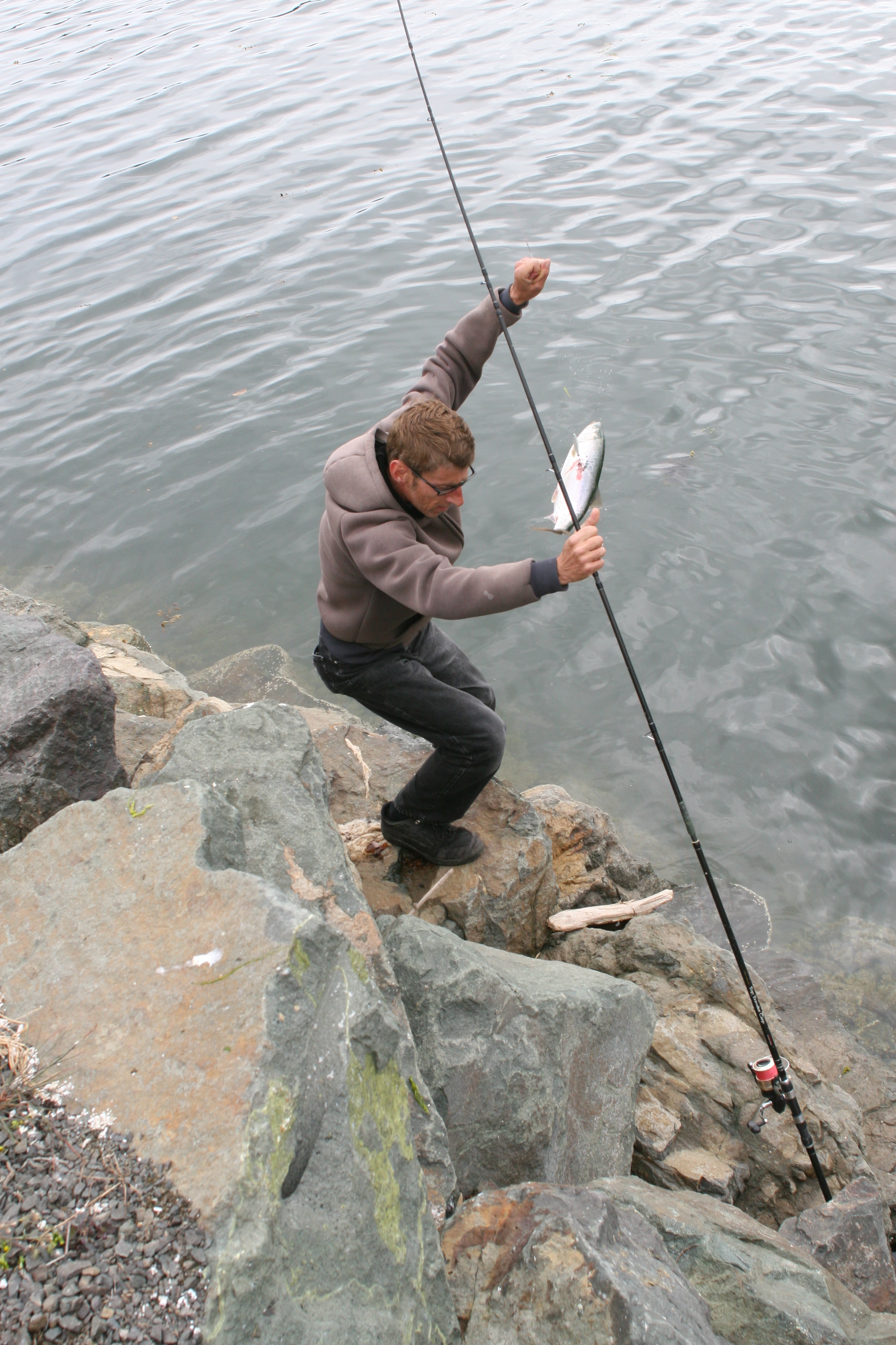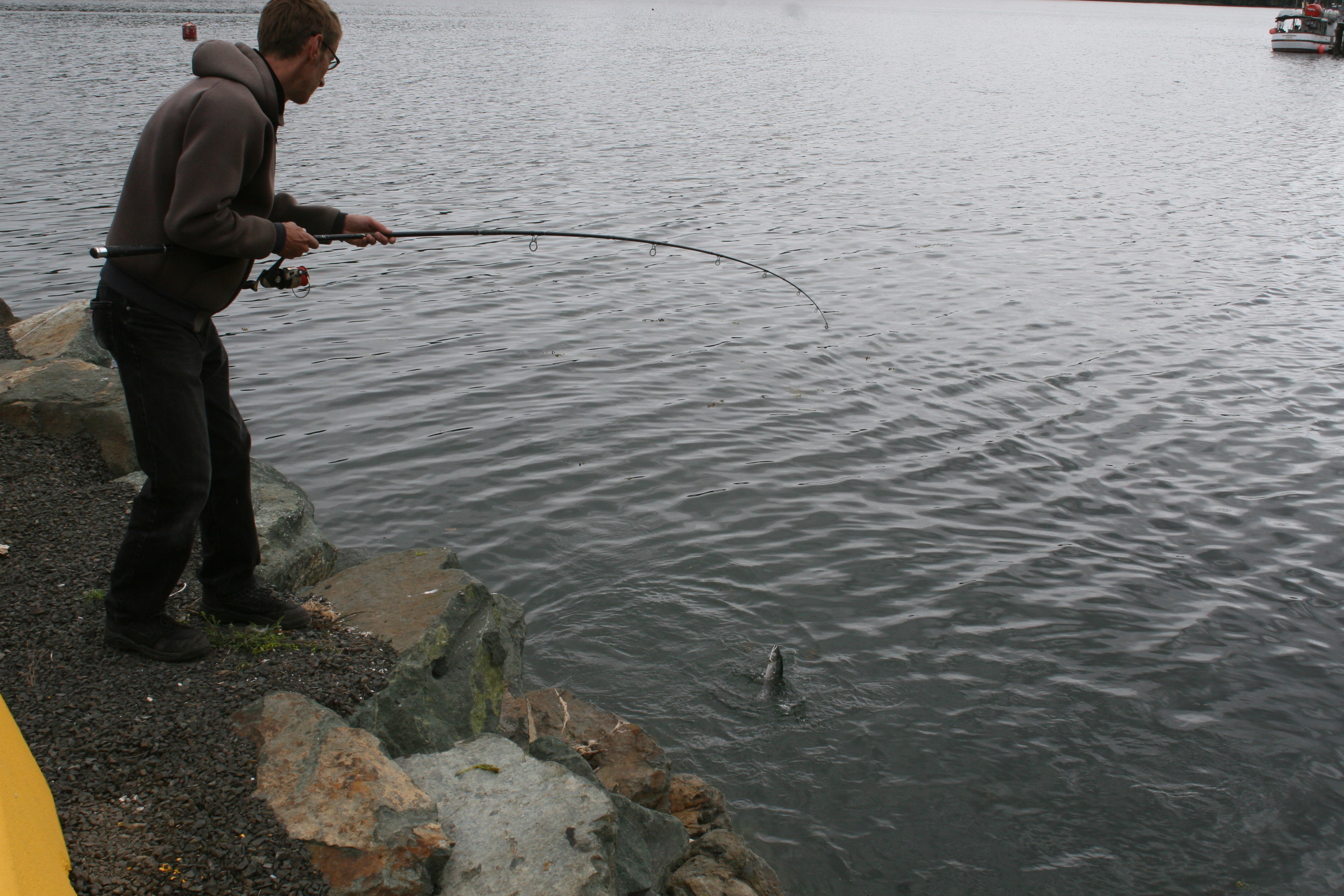 Voor het vissen vanaf de kant, de volgende dag, kregen we van Jim de tip het in de haven bij het watervliegtuigendok te proberen met een lepel of een zogeheten buzz-bomb. ‘There’s 5000 pinks in the hardbour waiting to get up the river’. De volgende dag bleek Jim geen woord teveel gezegd te hebben, overal waren springende zalmen, pinks, te zien.