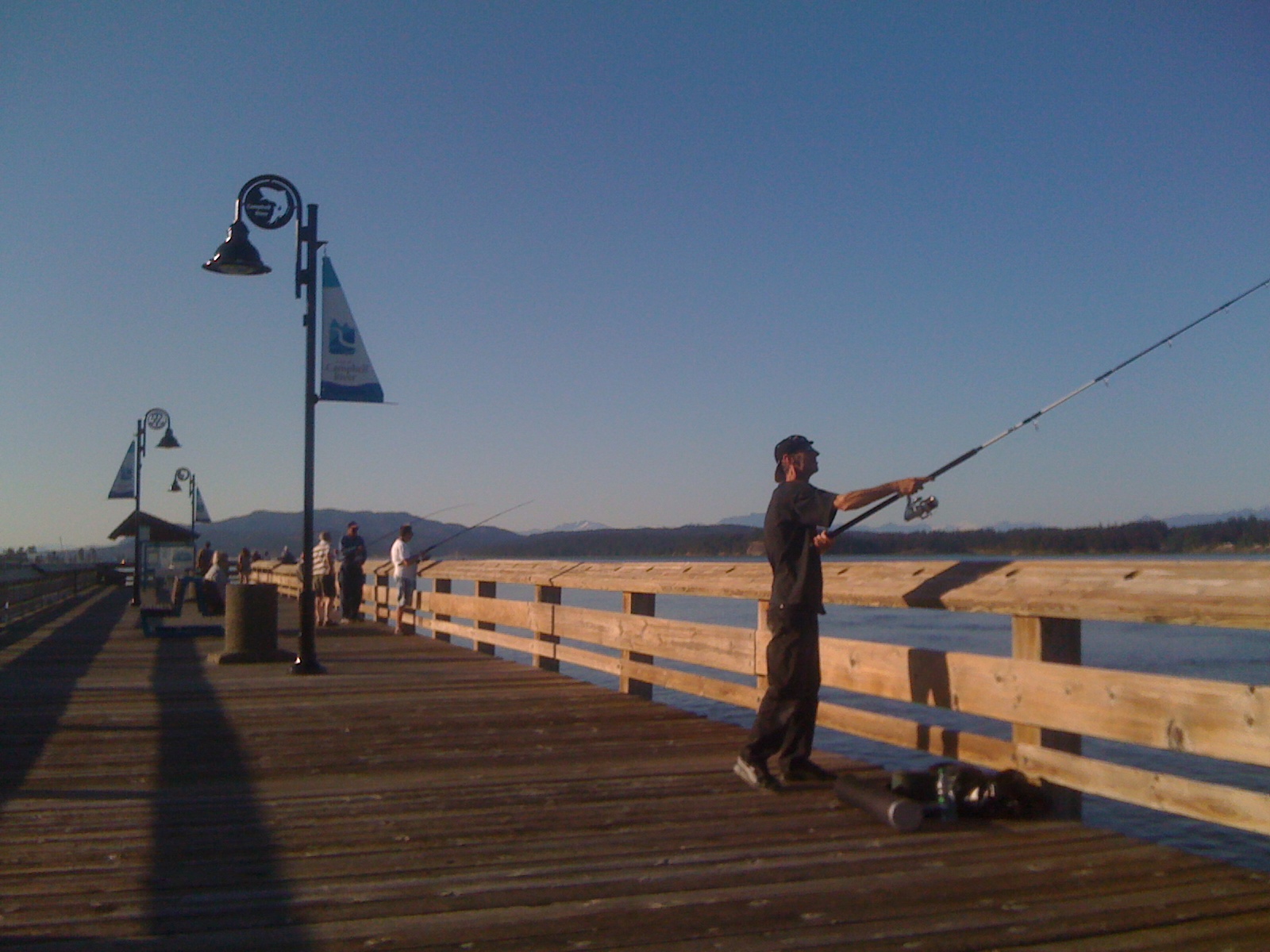 De overnachtingsplek werd Campbell River, aan de nauwste doorgang tussen het eiland en het vasteland. Er bleek daar een speciale vispier voor hengelaars te bestaan. In de avonduren hebben we er een paar uurtjes doorgebracht, ik vissend en Petra zat lekker in de zon. De afstand tot het water onder de pier was een meter of vijf en het stroomde fink. Toen we aankwamen stond er al een man met een erg kromme hengel en zijn chinook-zalm was ruim over de meter. Helaas leverde mijn twee uurtjes gooien met een pilker niets op, behalve op het laatst kelpwier waar ik de boel op stuk trok. Bij het weggaan haakte een andere visser weer zo’n monster.
