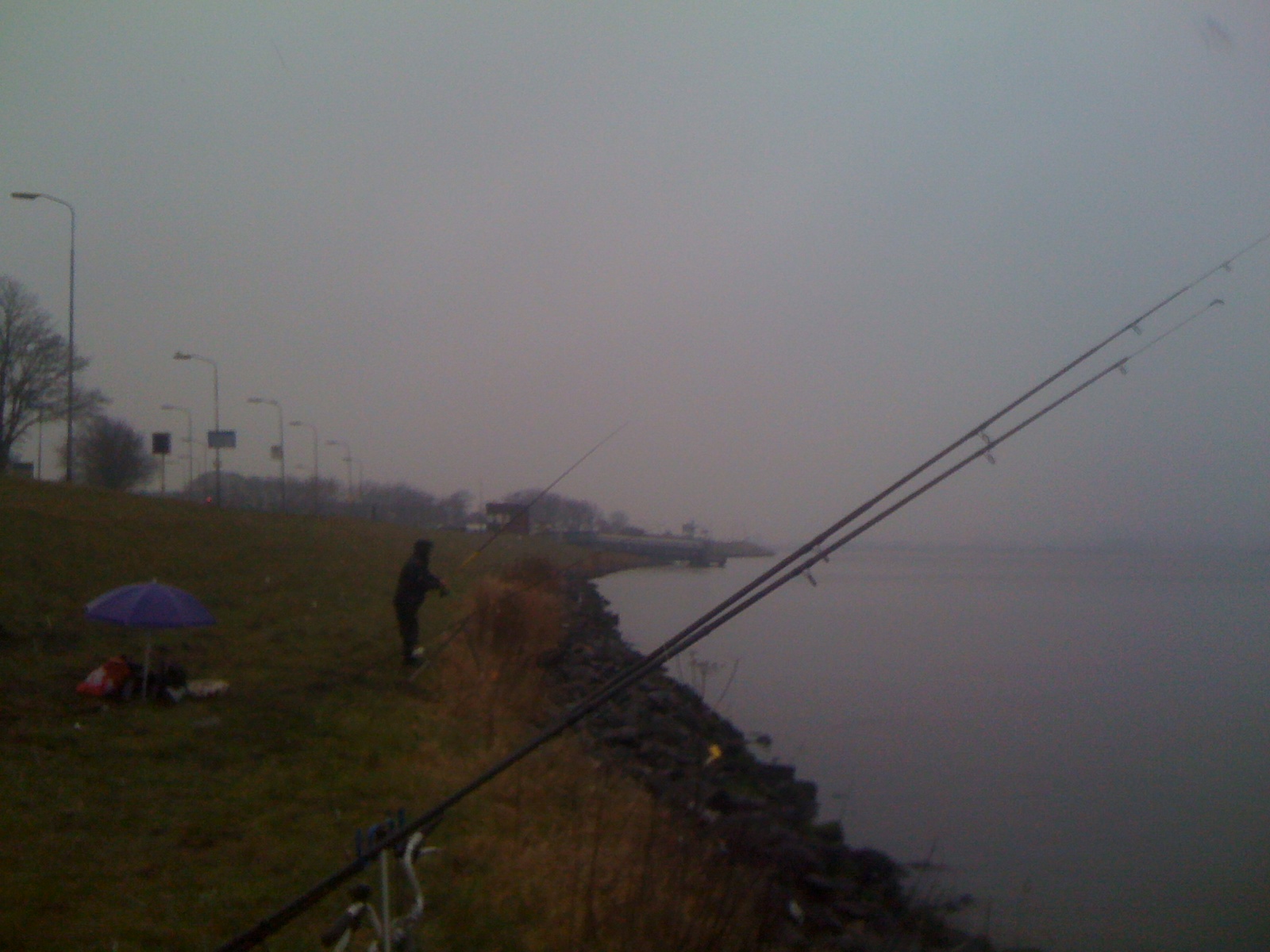 Met Nicolas vandaag drie uurtjes aan het NZK bij het Pontplein gestaan. Een redelijk comfortabele stek, gezien het weer: zuid 5 á 6 en sneeuw. Windje én sneeuw in de rug, handig voor brildragers. In dit kanaal kanaal kun je vanalles vangen, en het mist een beetje het zeevis-voel: voeten in het gras en verkeer dendert achter je. Ik was er al lang niet geweest.