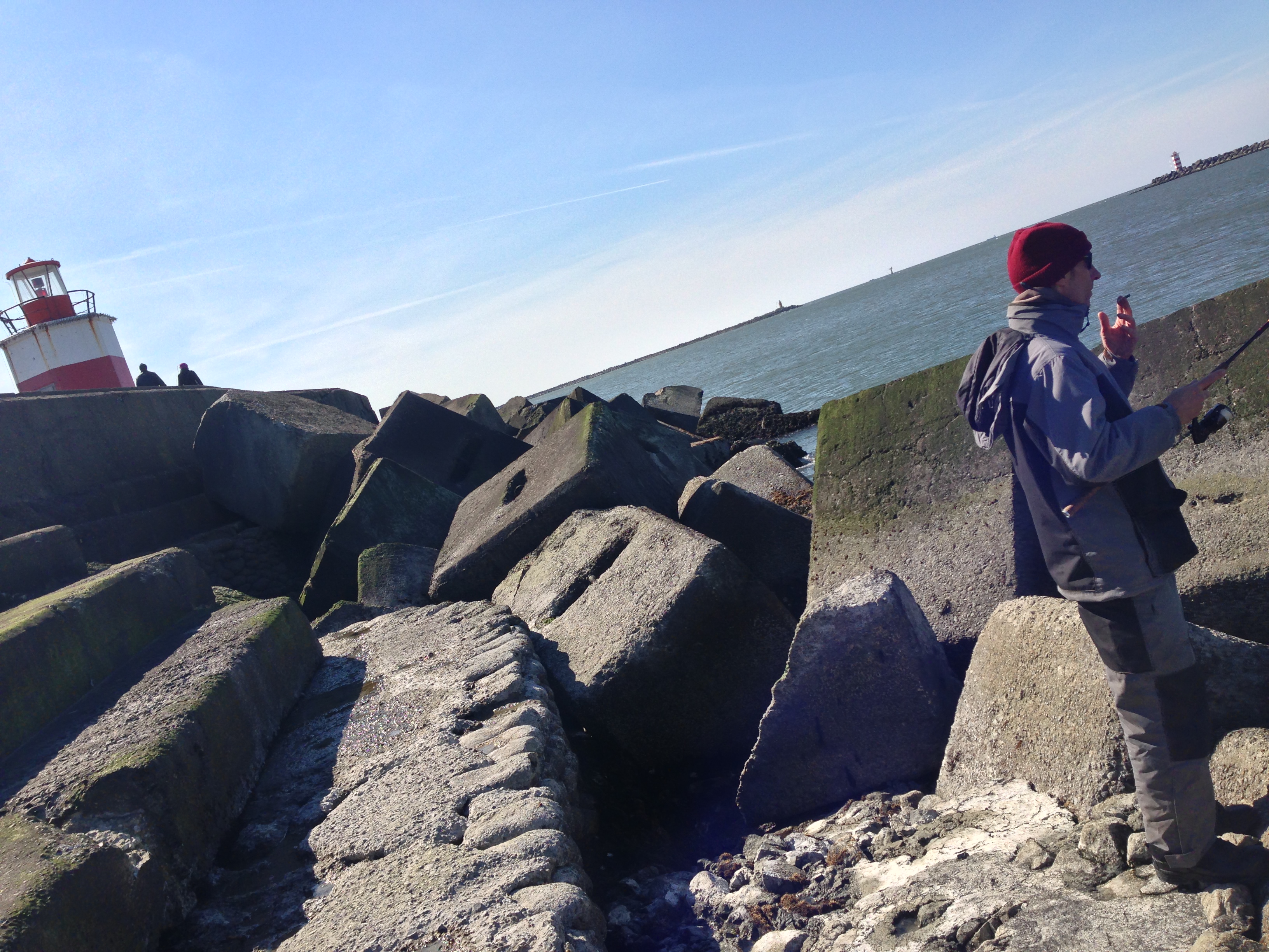 De plek werd het kommetje bij de oude kop, bij deze allesvriezende noordoostenwind een nog redelijk beschut plekje. En natuurlijk hoopte ik bij toeval een zeeforel te haken, omdat daar het water ietsie warmer zou moeten zijn doordat er minder wind en even veel zon op stond. Het tij was afgaand tot laagwater rond 15:40.