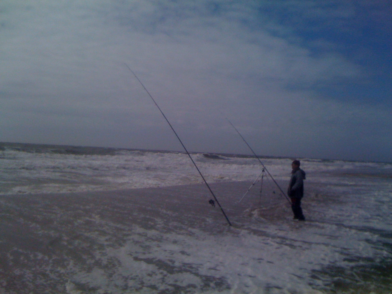 Rond 16:30 stond de teller nog steeds op 0,0 en het water was bijna tot aan de duinen opgestuwd. Het aas had het in de branding zwaar, maar had geen last van vreterij door krabben, laat staan vis. De buren hadden een botje weten te vangen. We besloten het hier voor gezien te houden en op zoek te gaan naar een andere stek.