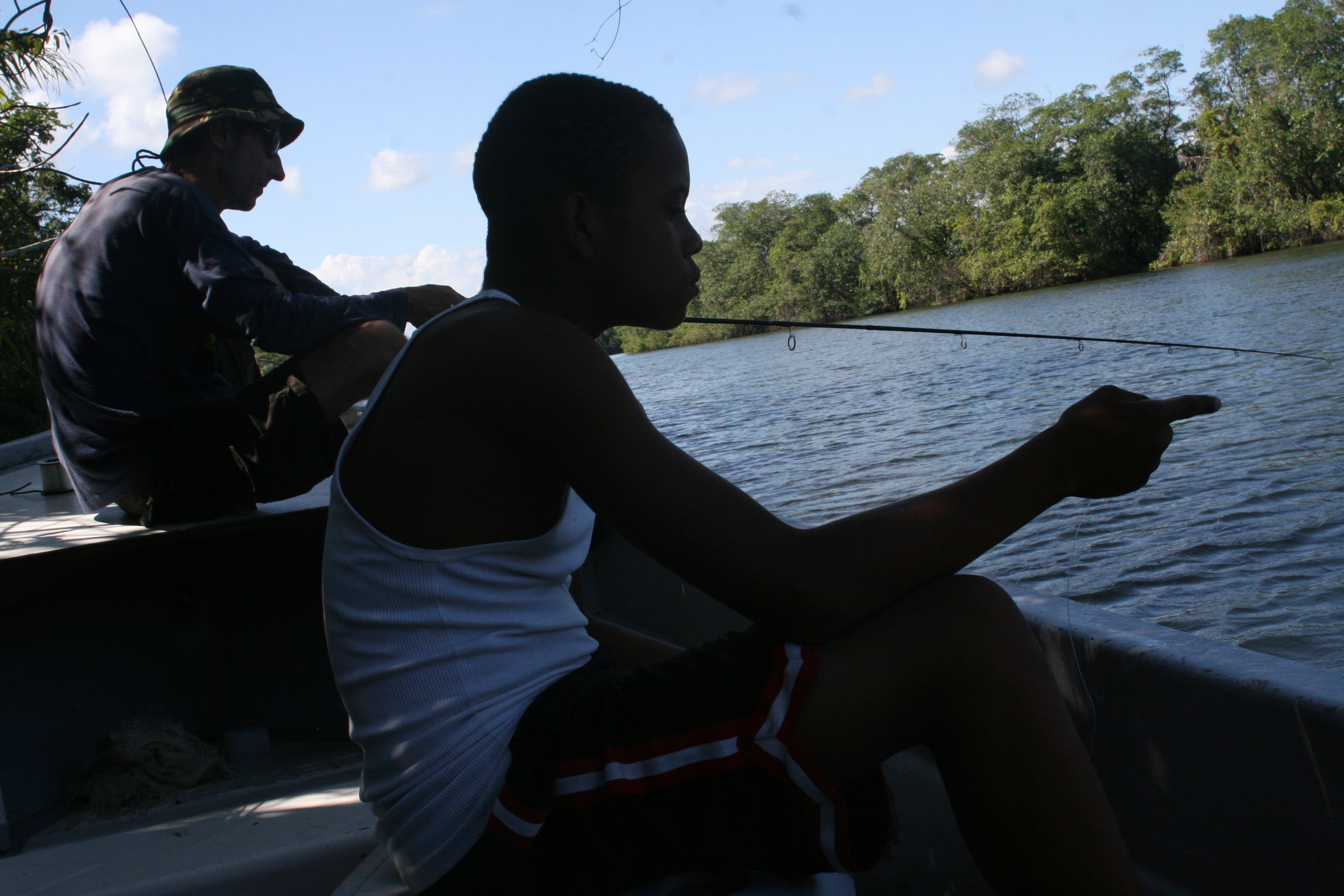 Daarna wordt met het anker effectief een van de geulen in de rivier opgezocht. Na een paar pogingen zijn de heren tevreden. Orlando en José vissen met handlijnen (zeker 70/00mm nylon met een paar haken minstens 5/0), één beaasd met garnaal, de ander met een aasvis.