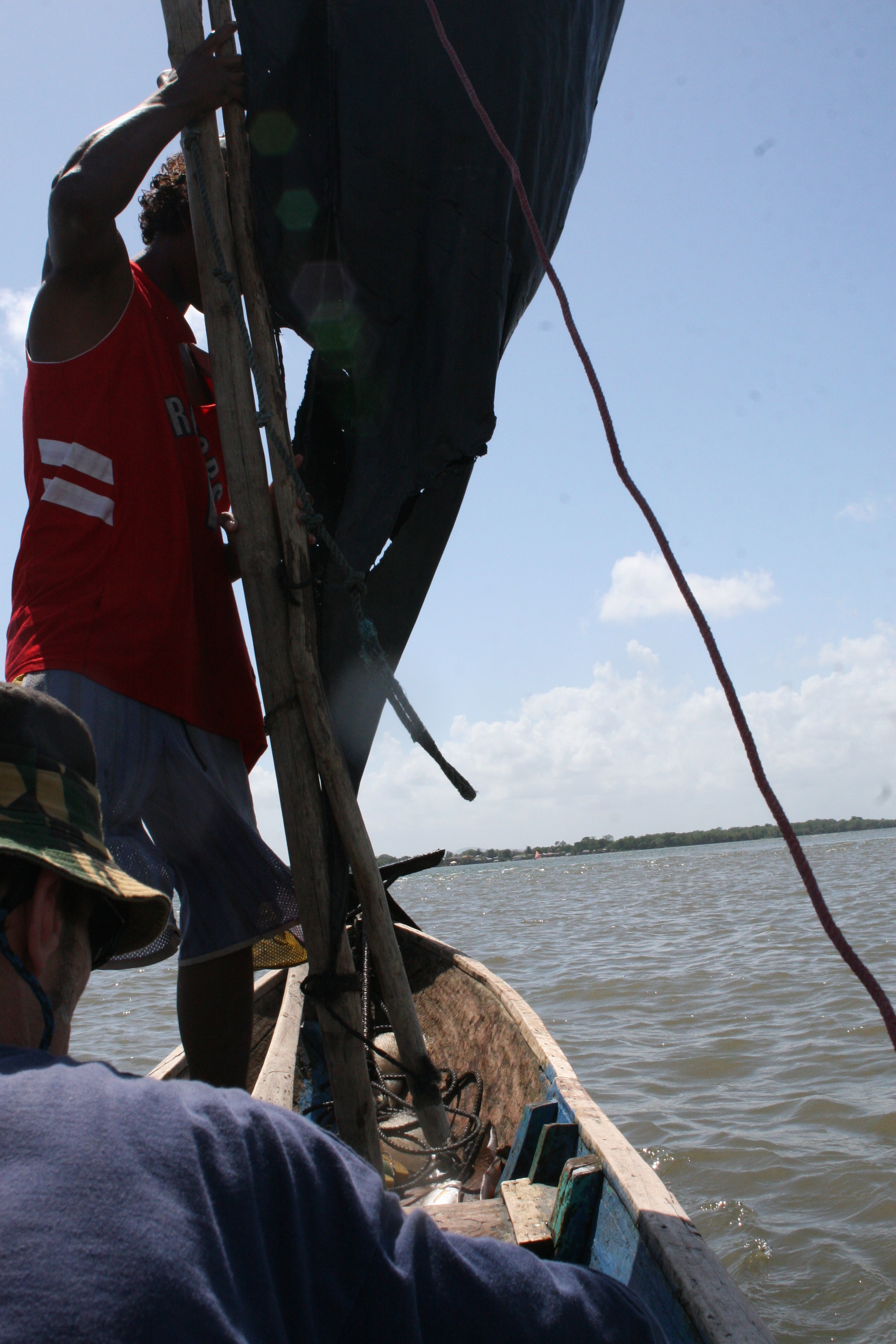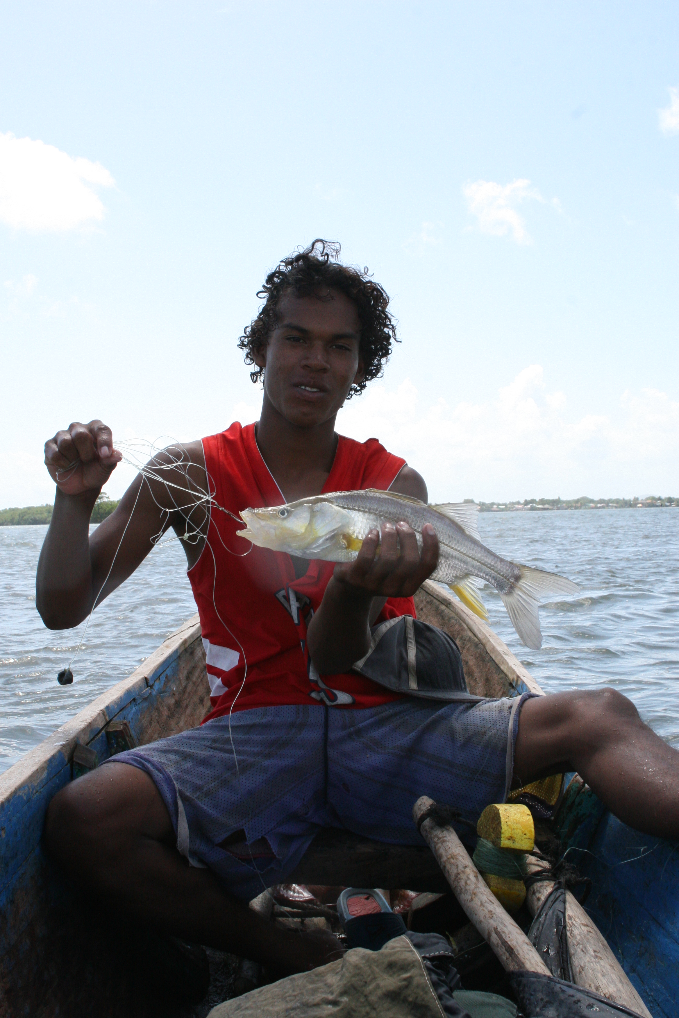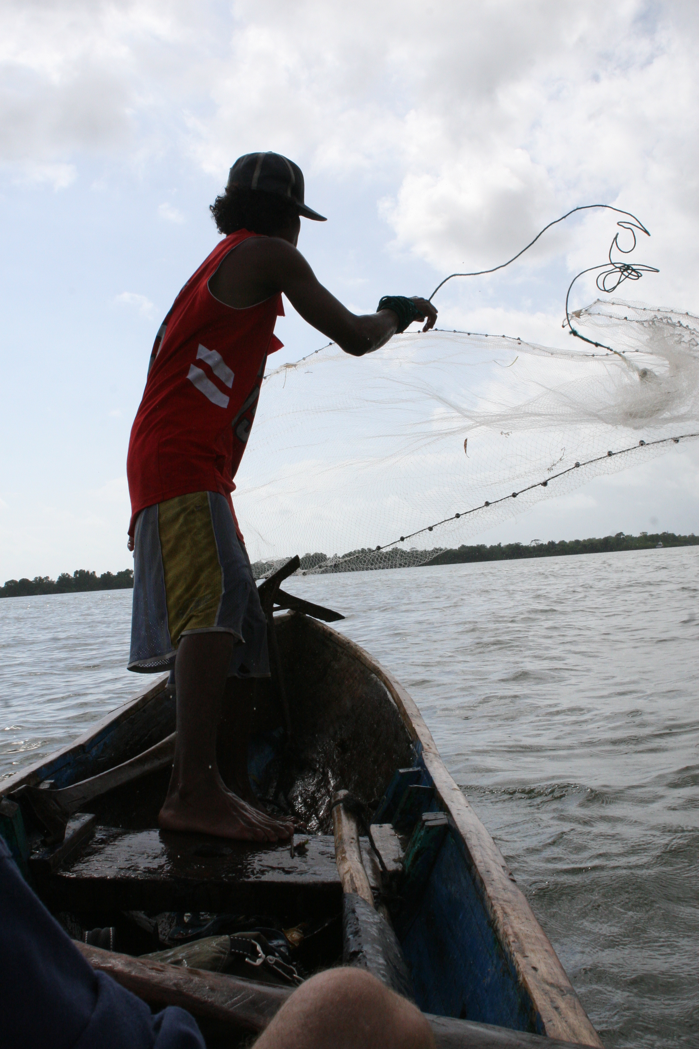 Onze eerste vistrip deden we met Miskito indianen bij de monding van de rivier, brak water dus, met kans op van alles. Orlando en José namen ons mee in hun eigen boot vanuit hun dorpje. De uit een boomstam uitgehakte kano heeft een zeiltje van zwart landbouwplastic. Ze hebben het niet breed hier. We hebben de wind tegen en moeten tegen de stroom in peddelen. José vangt aasvis en garnalen met een werpnet.
