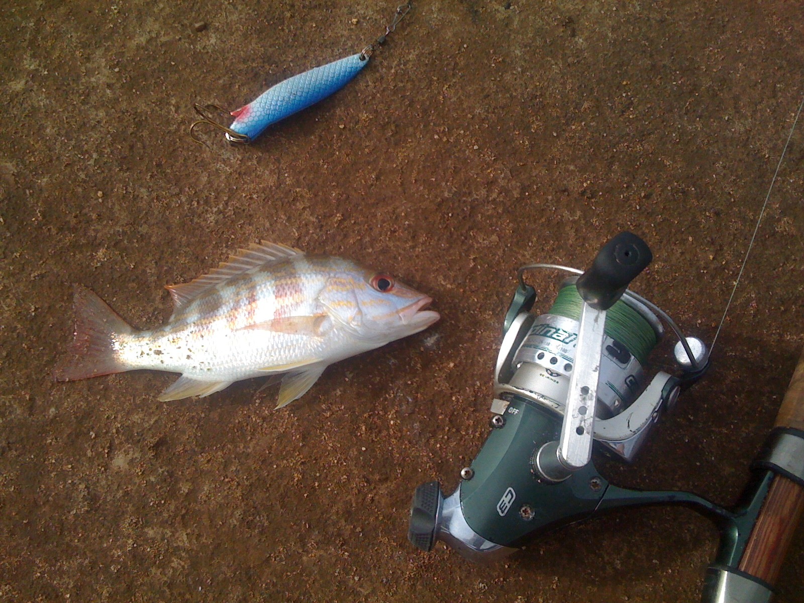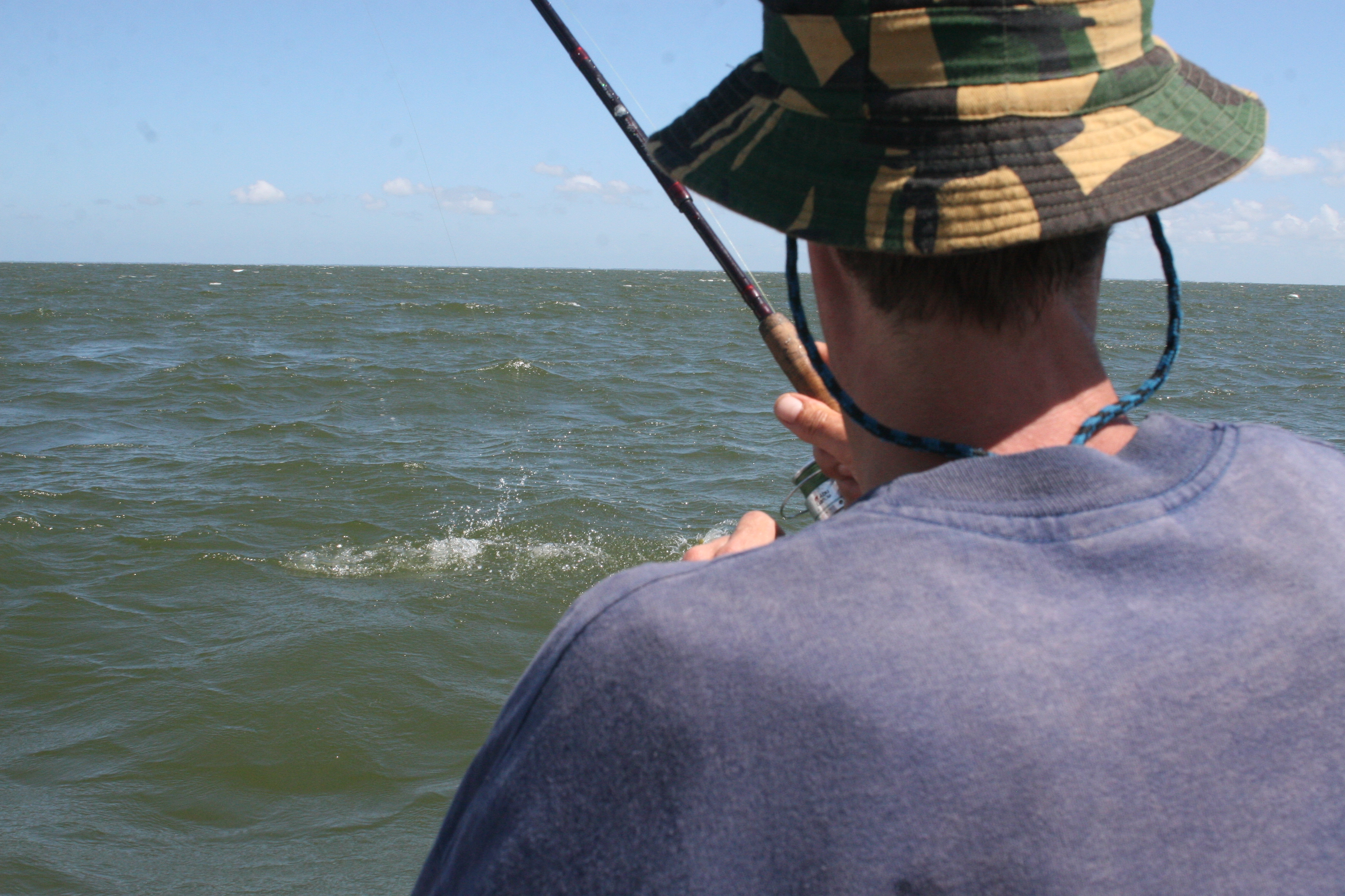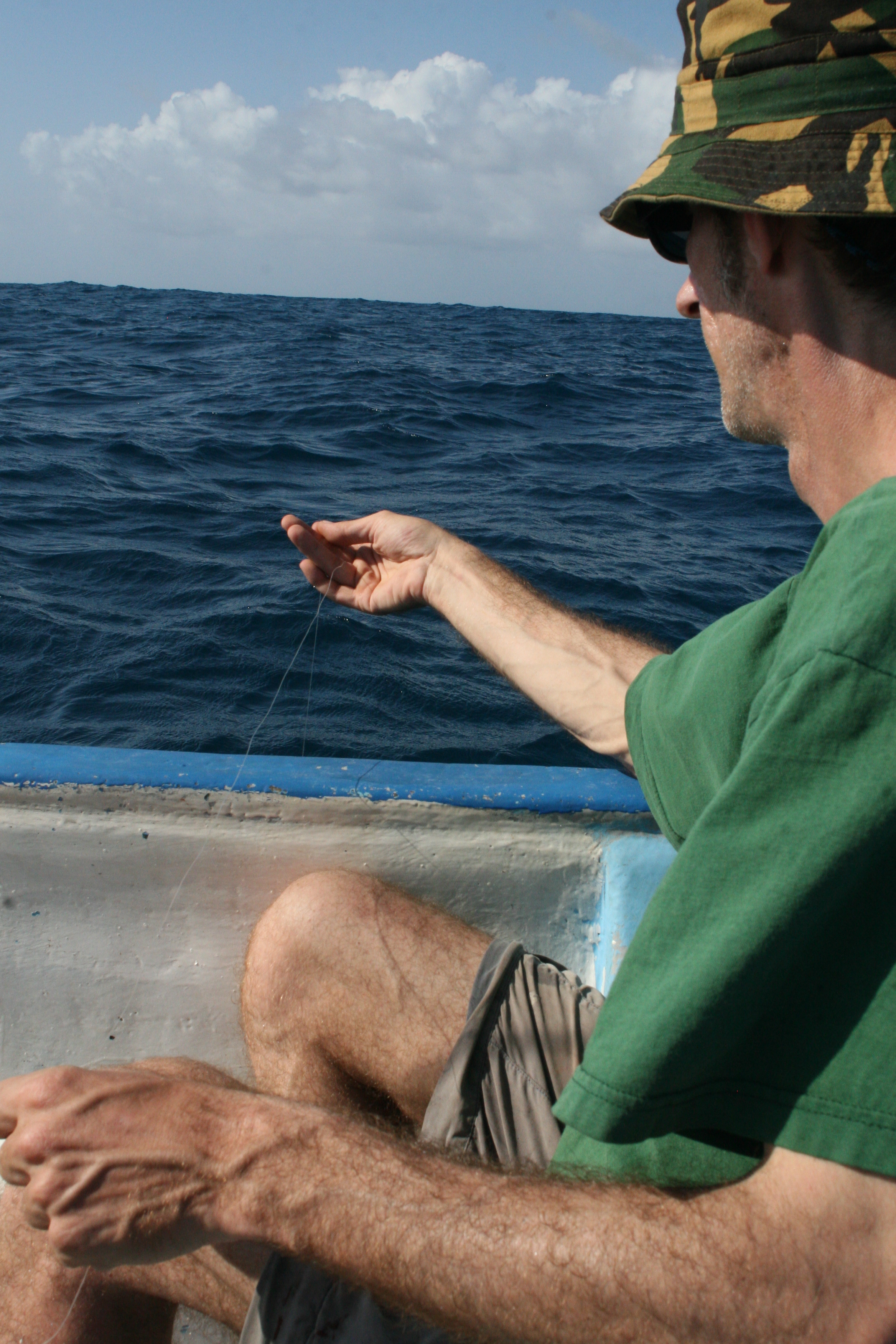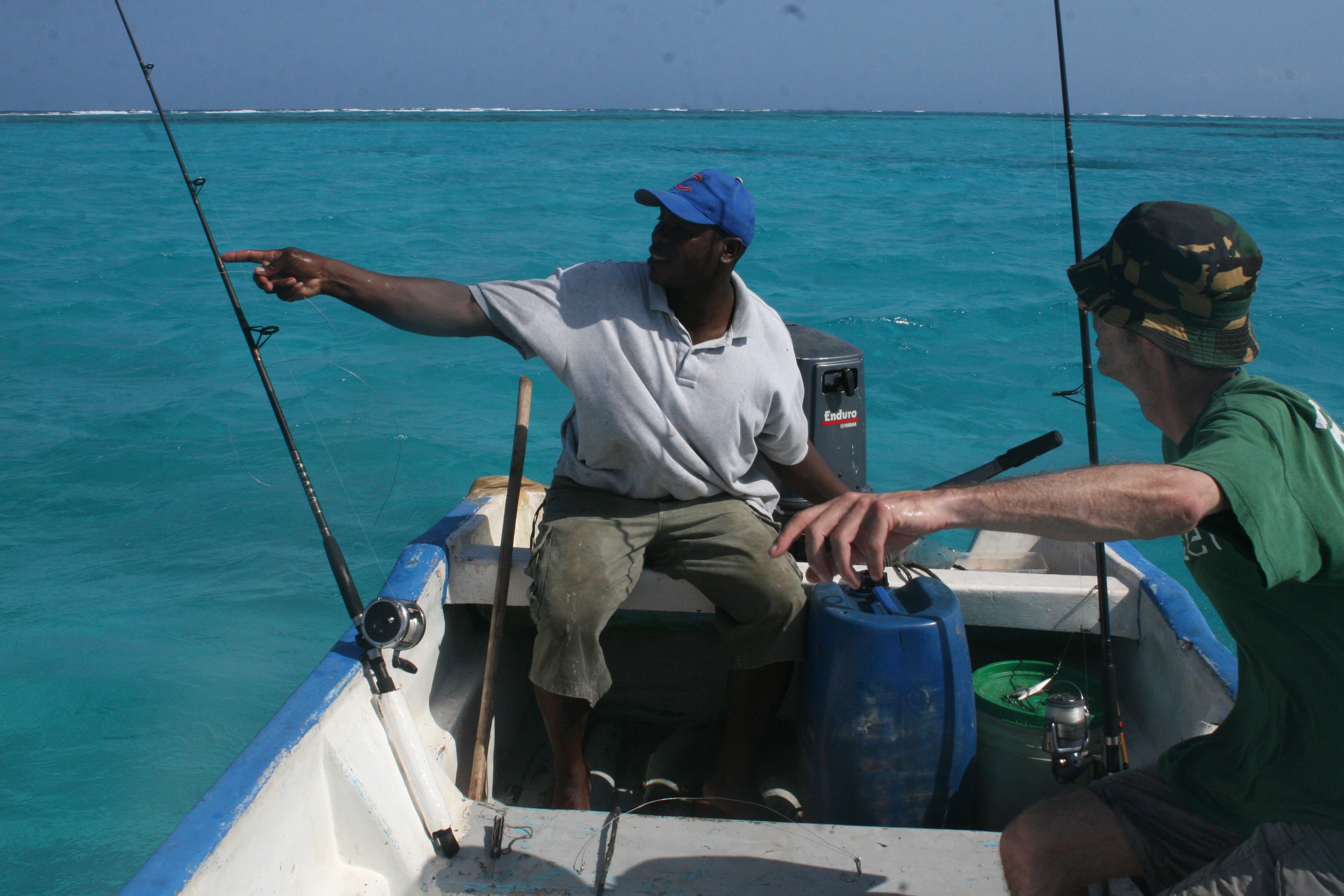 De volgende dag komt Alfonso langs, terwijl ik sta te gooien vanaf het piertje. Alfonso heeft zin om te gaan vissen, maar geen klant. ”No worries, just pay some for the gas, and then we go fishing.” We varen naar een plek nét buiten het rif boven een wrak, die hij zonder gps perfect weet te vinden. Werpend vangen we kleine snappers. Op een gegeven moment zien we drie fregatvogels duidelijk iets volgen en duiken en besluiten er achteraan te gaan. Alfonso meent een marlijn te hebben gezien. Afwisselend vissen we slepend, driftend en werpend. We vangen diverse kleinere vissen die we ook gebruiken als levend aas. Ik werp met mijn spinhengeltje en een 20 grams blauw tobylepeltje. De vogels en ons bootje komen dichterbij elkaar, en BOEM…ja hoor.