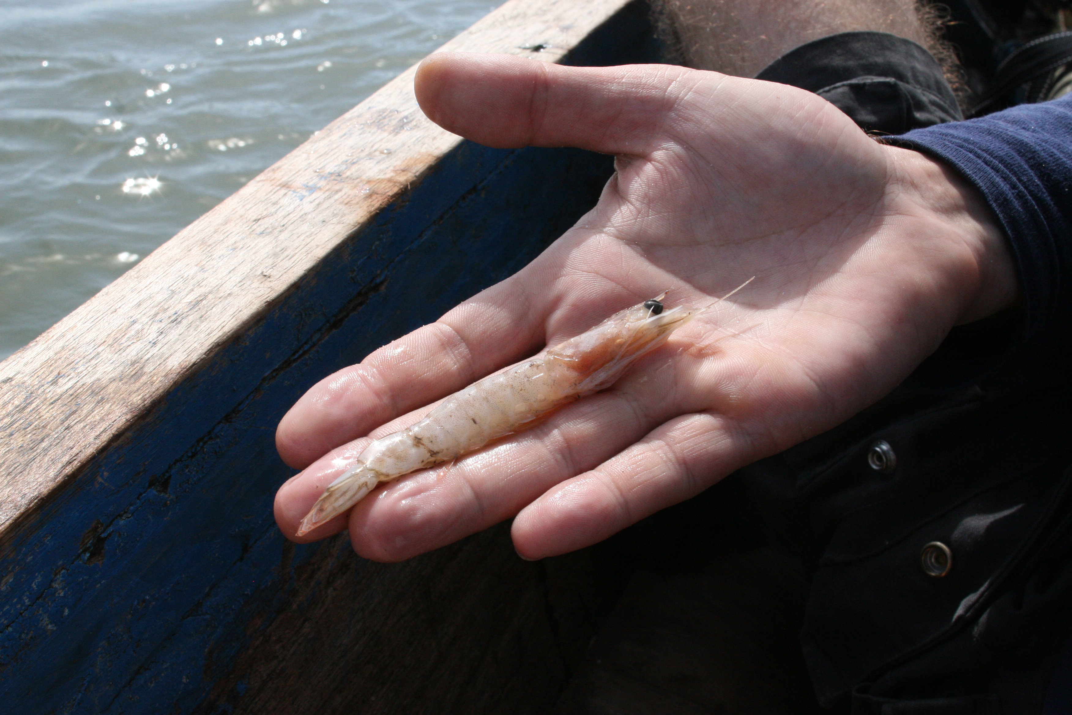 Op de rivier leggen we even aan bij collega-vissers die vroeg in de ochtend garnalen hadden gevangen. De bijna 10 cm grote garnalen zijn het meest gebruikte aas hier voor de handlijnen.