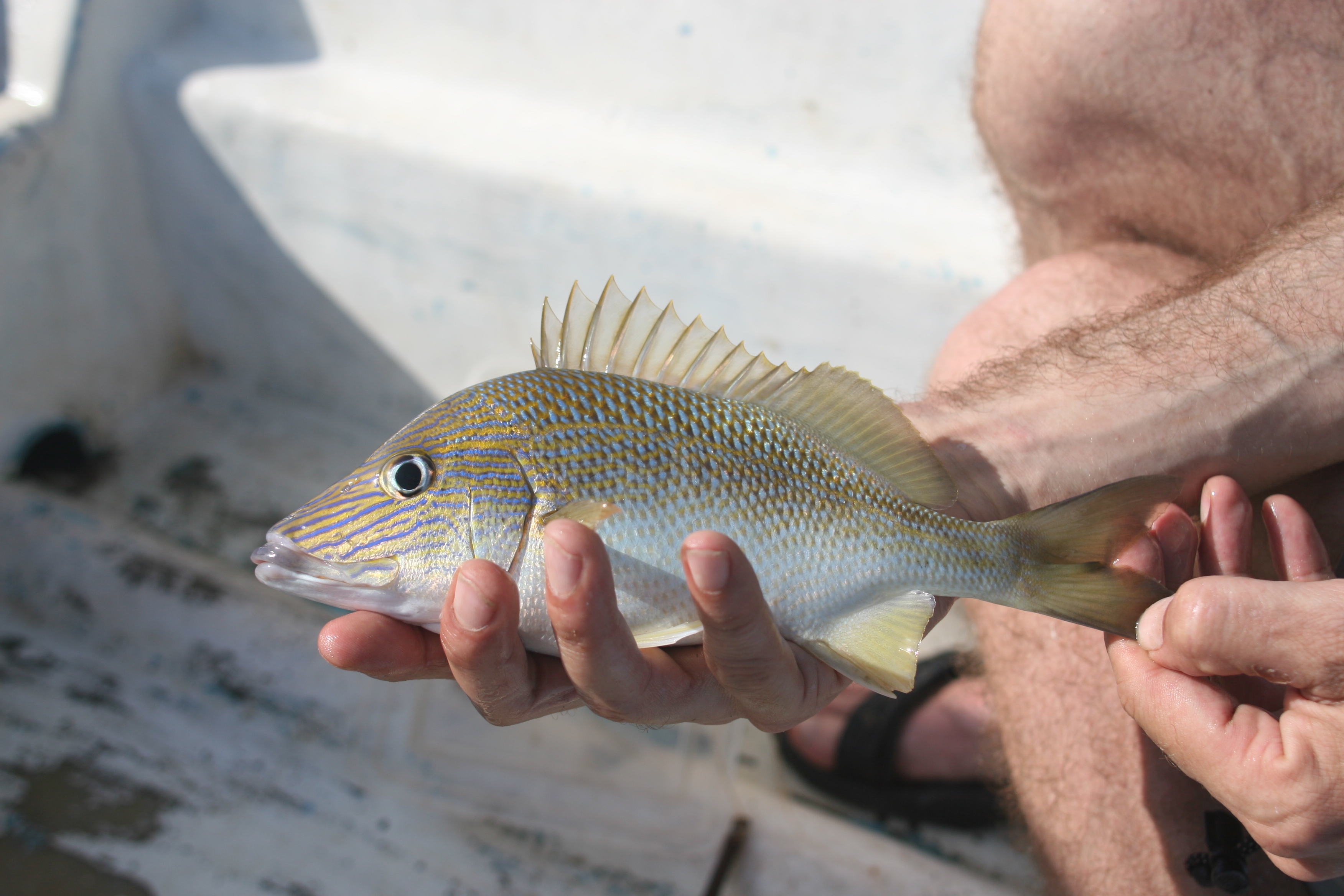 Op het rif rond het eiland zien we in het kraakheldere water kleine en grote zeeschildpadden. Ook vissen we nog even met handlijnen en vangen kleine snappers en rotsbaarsjes.