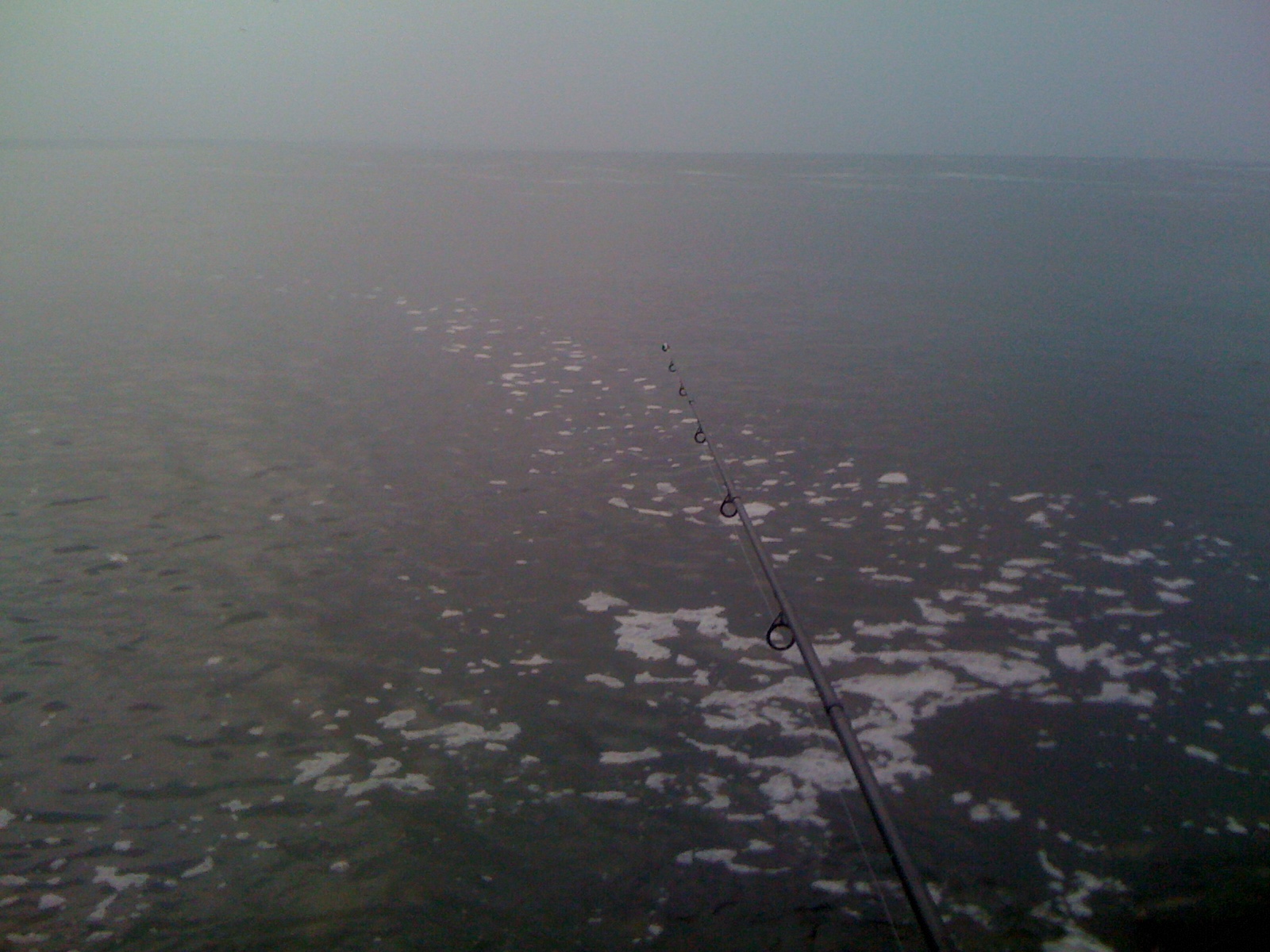 Er werd druk gevist voor m’n neus: een klein particulier bootje zonder naam was trek na trek aan het slepen met een flink formaat garnalennet, even verderop draaide een beroepskotter z’n rondjes. De aalscholvers kwamen vaak boven met vangst, en ook een bruinvis cirkelde in de buurt wat rond. Het belevenings-stukje van het vissen was vandaag smaakvol verzorgd, rust en veel (dieren)activiteit. In een straal van ruim 20 meter rond m’n stek heb ik, in de ruim twee uur dat ik er zat, regelmatig geep zien springen. Af en toe vlak bij de dobber. Ze zaten er dus echt wel en hadden, wegens andere bezigheden, even geen trek. Ook dieper vissend leverde geen toevallige fint of makreel op. Het vang-stukje van het vissen komt dus een andere keer aan de beurt.