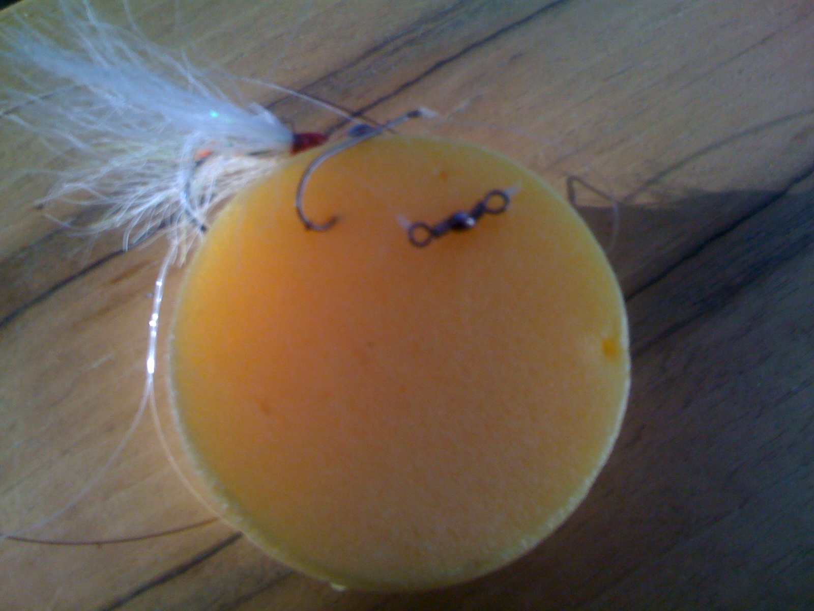 Al aas diende een makrelenbuikje uit de diepvries om reepjes van te knippen. De eerste aanbeten beloofden niet veel goeds, want ondanks de tijd die de happers van me kregen, sloeg ik een gaatje in de lucht (hard aanslaan heeft totaal geen zin bij deze visserij). Mja, tóch maar weer kleinere haken monteren om die gepen te pakken te krijgen, of stug doorgaan met deze onderlijn….?