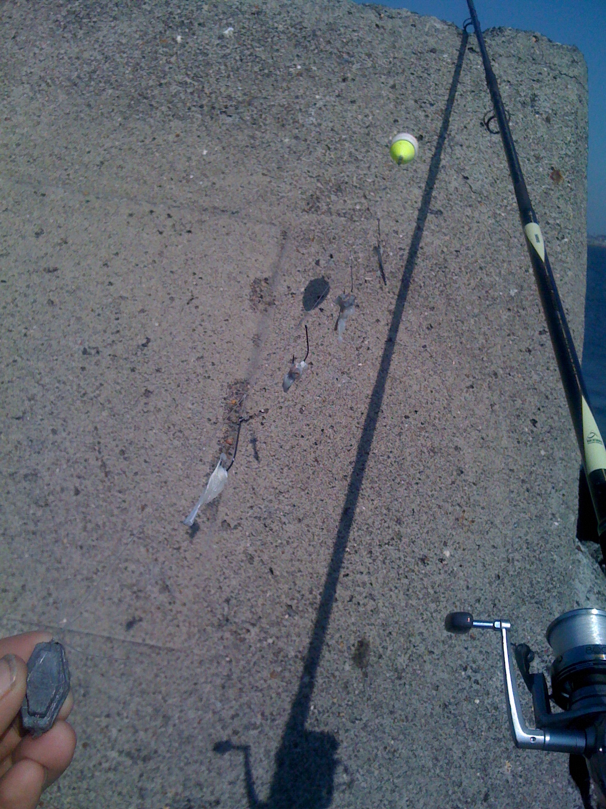 Vier haken, verdeeld over ruim een meter, beaasd met een reepje vis. Een forse schuifdobber en onderaan de lijn een loodje van 50 gram. Met het windje mee, lukte het dit geheel met een strandhengel een meter of vijftig weg te krijgen. De dobber afgesteld op twee meter.