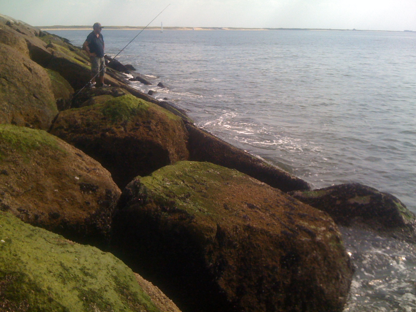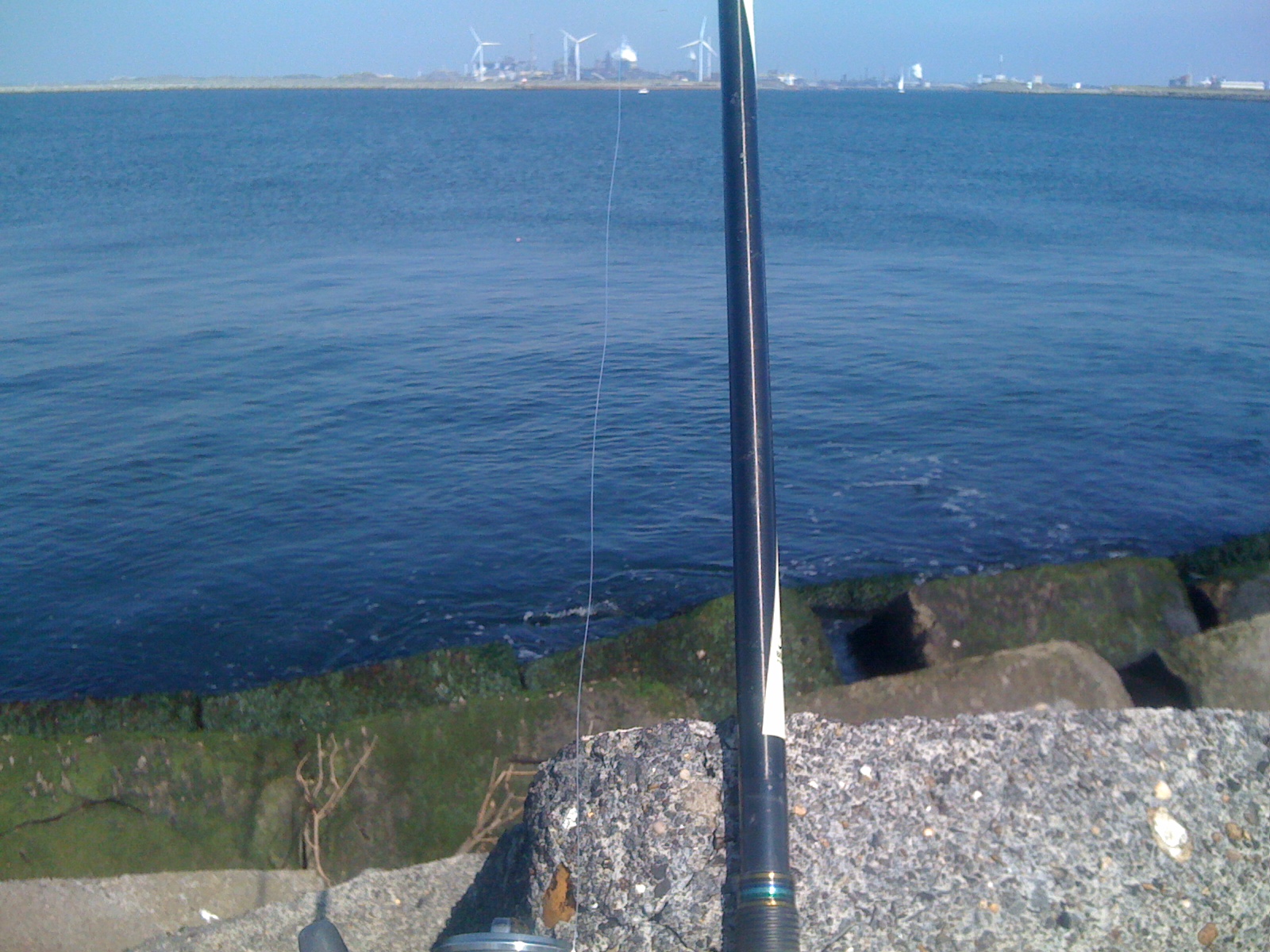 De wind stond donderdag gunstig om ook aan de binnenkant te kunnen vissen, want je hebt dan de wind in de rug. Ik ging twee methodes afwisselen. Aan de buitenkant dobbertje/zager voor een baars en aan de binnenkant op makreel. Dat gaat niet samen, maar is, met twee hengels, goed af te wisselen.