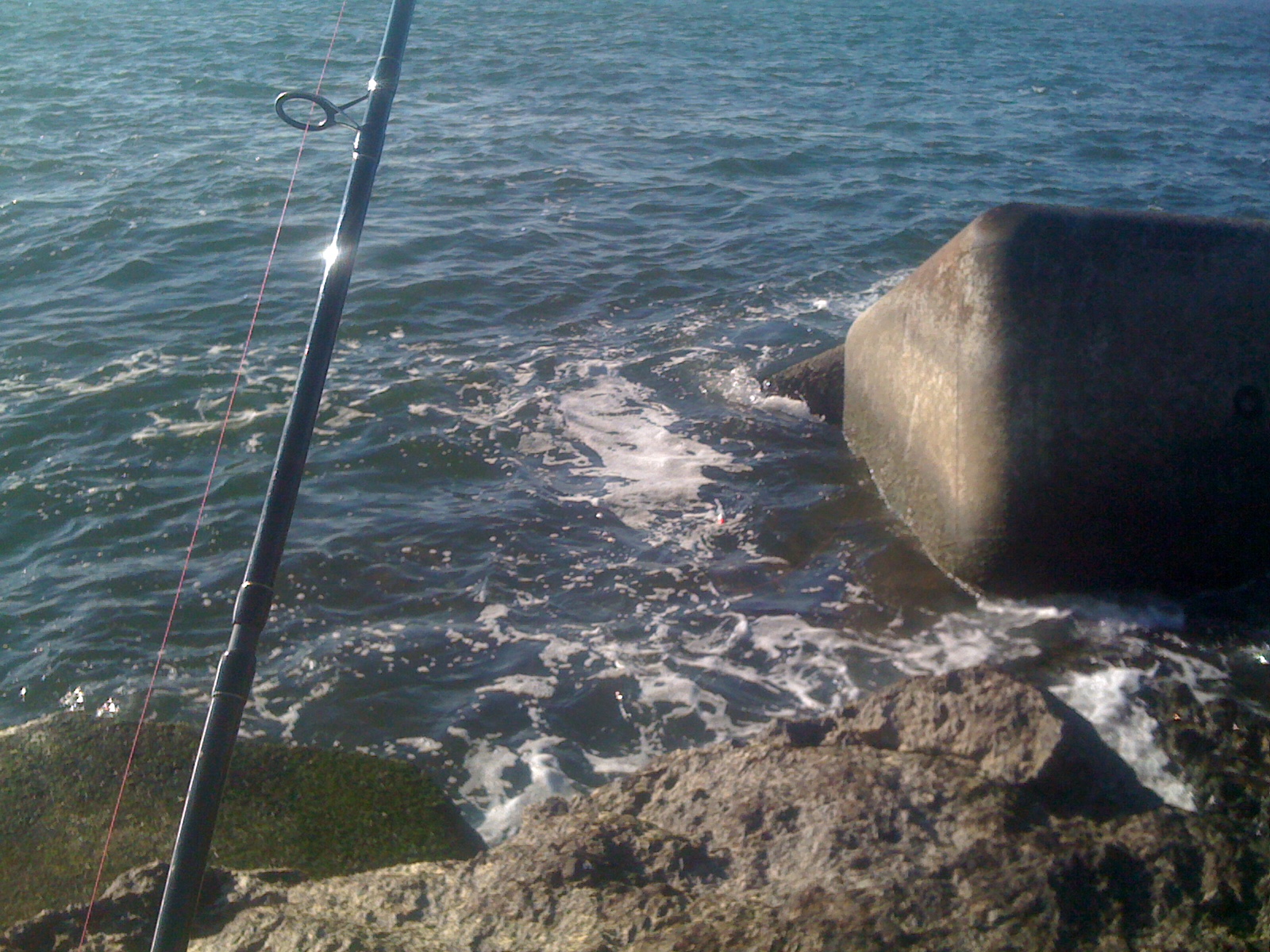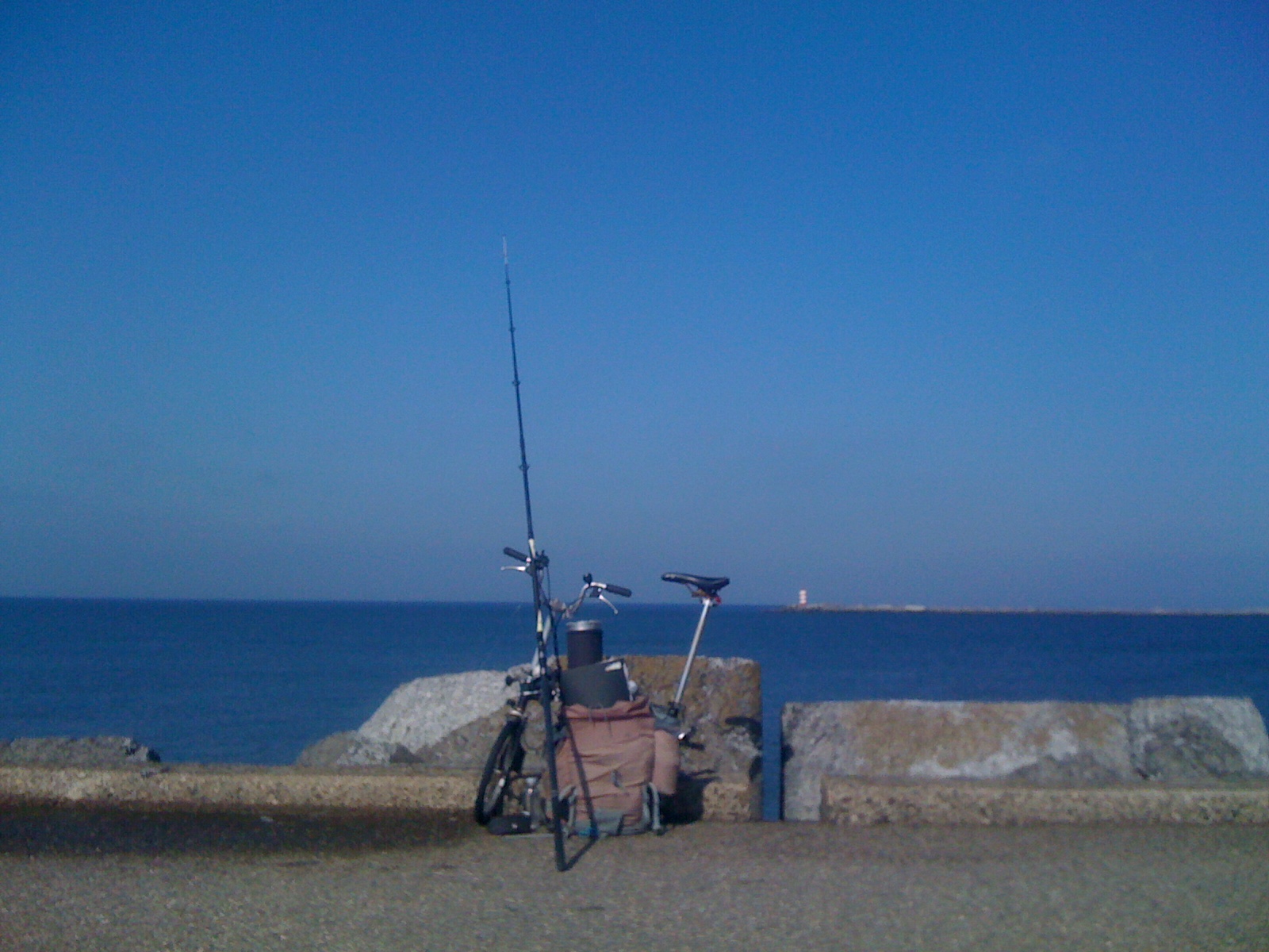 Ik deed het vrijdag rustig aan en fietste rond 12:30 uur de pier op. Zonnig, windkracht 6 Bft uit het zuiden en 12:15 uur laag water. Een beetje voorvissen aan het wedstrijdstuk (het lange rechte eind aan de binnenkant van de zuidpier) en dan een paar uurtjes opkomend tij meepakken (hw 16:18).
