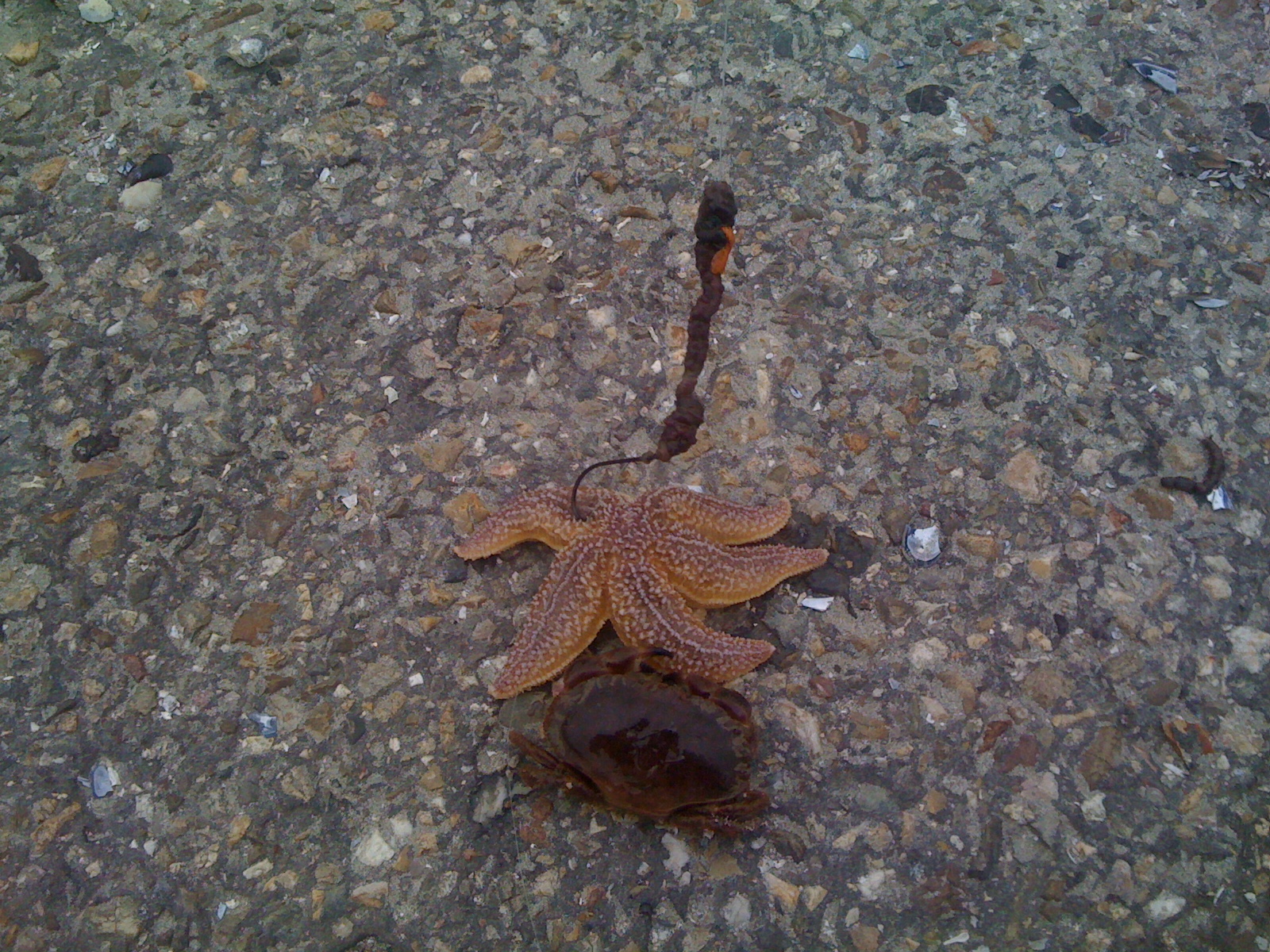 Het dichtbij vissen leverde niets op. Soms lege haken, veel vastlopers en geen aanbeten. En m’n andere kunde, het vangen van krabben en zeesterren, kwam ook weer even langs met een mooi doublet van een zeester en een krab. Aan één haak. Op de stenen liet de krab pas los.