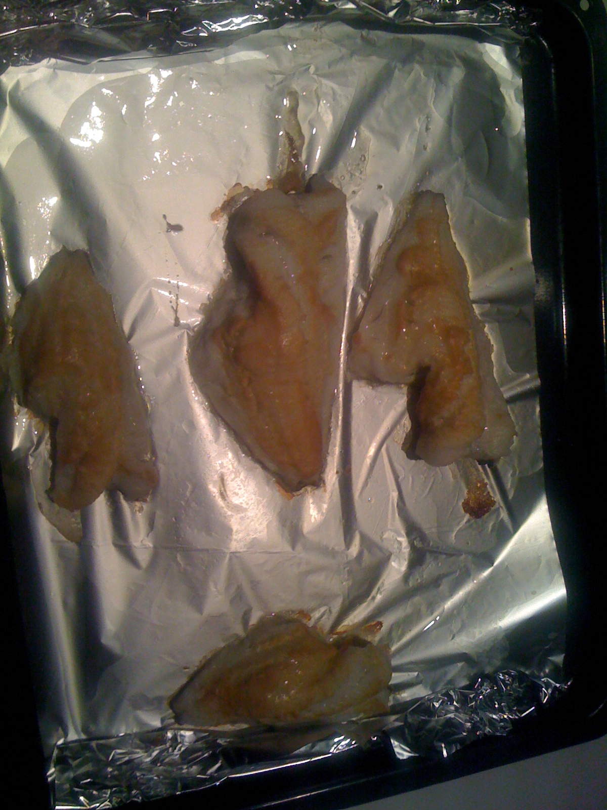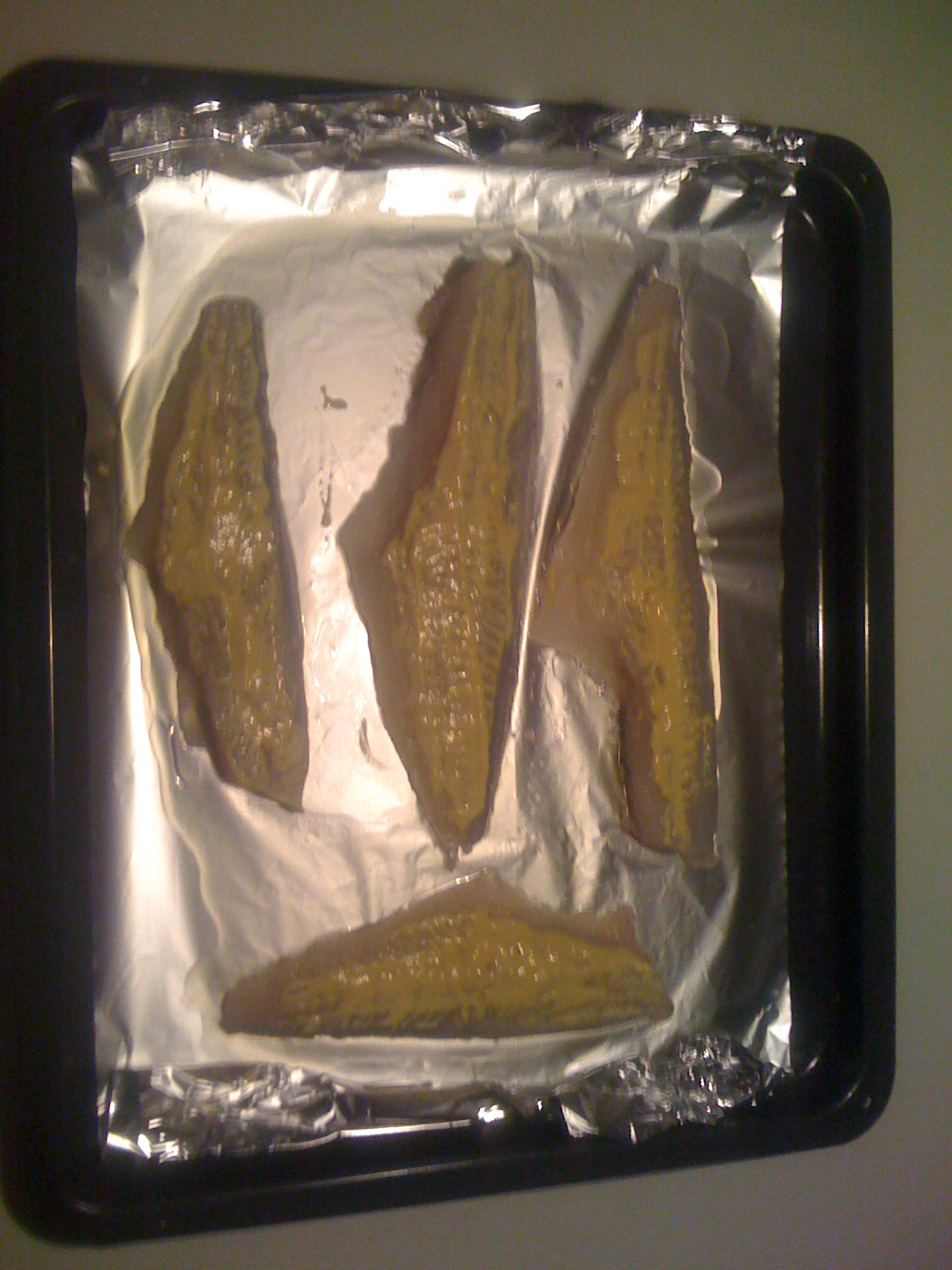 Oh, en daarna zijn de fileetjes met mosterd besmeerd de oven in gegaan.