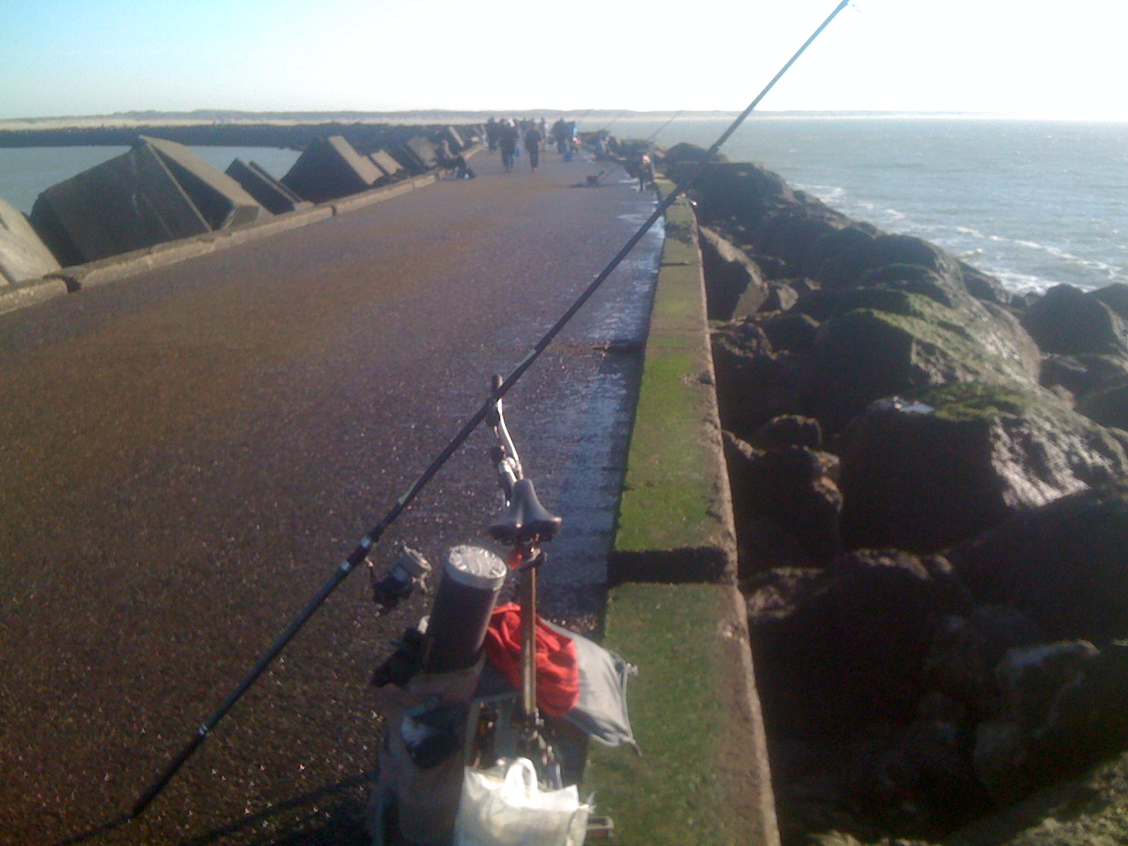 De lucht was blauw en de zon deed ook goed z’n best. De zuidoosten wind was toch wat aan de frisse kant. Ik sloot aan achter de rij vissers, hoopvol. Een hengel leek me wel voldoende…