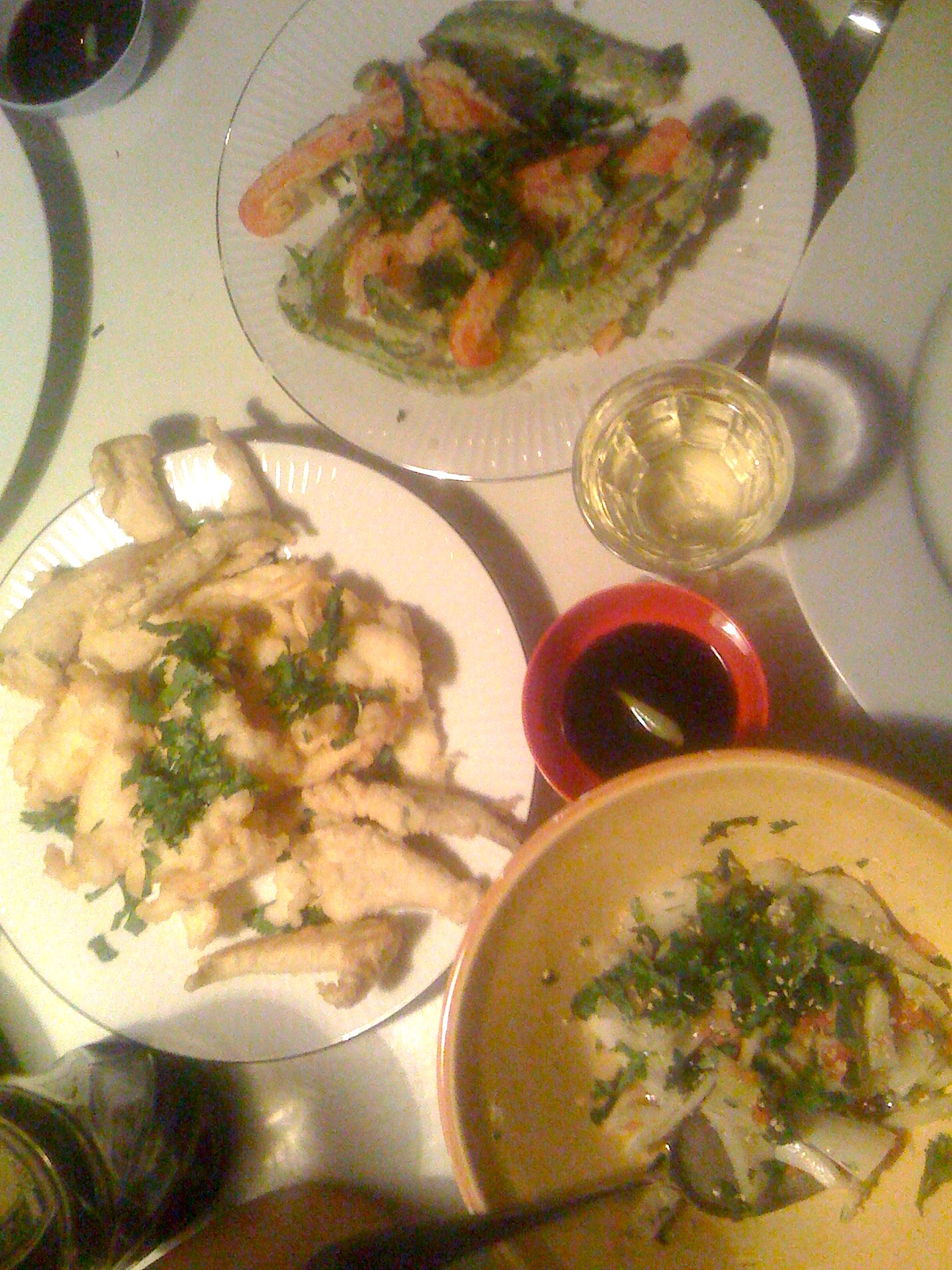 Het werd scharfilet en scharkuitjes én paprikareepjes gefrituurd in een jasje van tempuradeeg samen met een salade van gestoomde venkel met een dressing van sesamolie. Rijst, bakje kikkoman met wasabi en een glaasje witte wijn erbij: we hebben heerlijk zitten smikkelen. Hoeven we daarvoor ook al niet meer naar een Japanner toe…