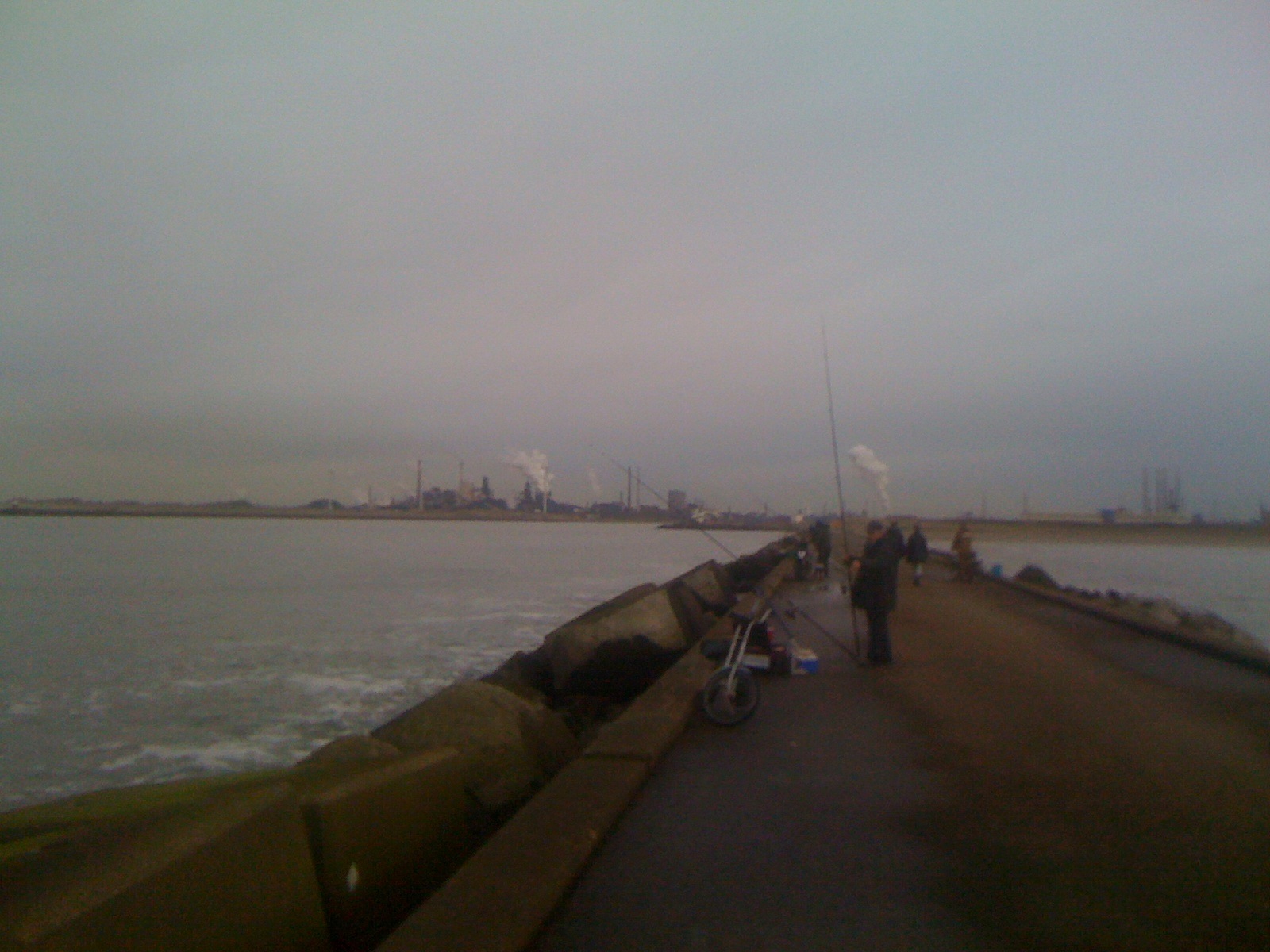 Het was nog niet druk, maar de reeds aanwezige vissers hadden al wat vis in de emmers. Uiteindelijk stonden we met vijf man op een rijtje. De scharren gaven niet thuis dus de tweede hengel ging ook onder de kant voor een gul.