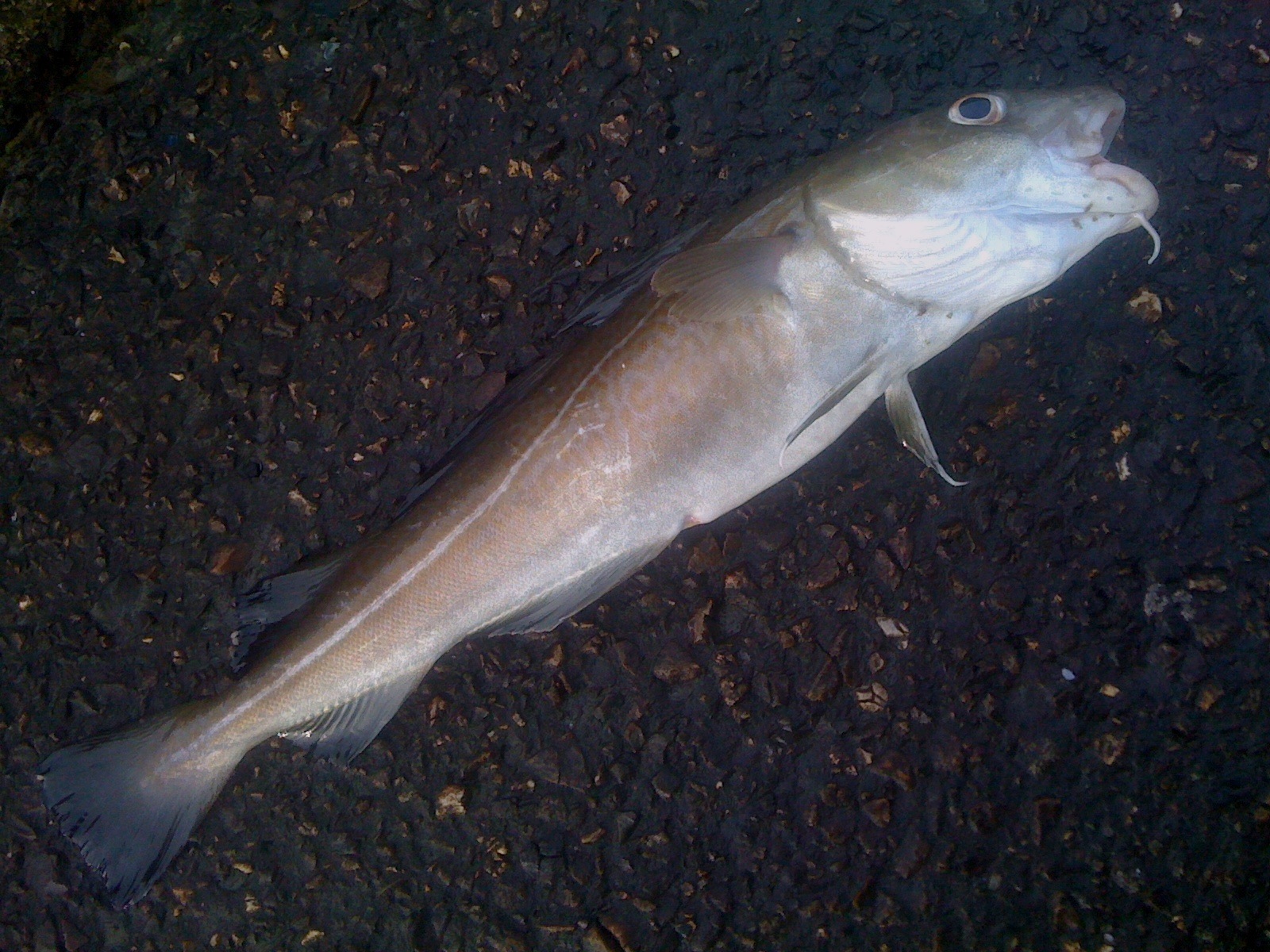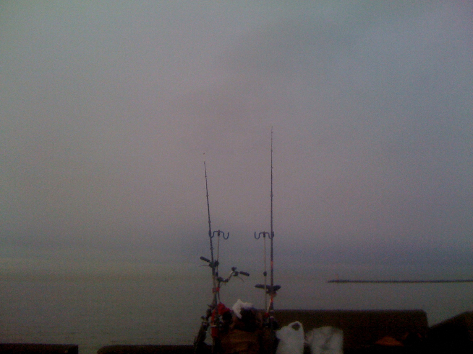 Hoewel, uiteindelijk ving ik m’n enige visje op een diepvries mesheft aan de linkerhengel, terwijl ik aan de andere hengel met pieren van Bertus (nog bedankt!) aan het vissen was. Ook lag die montage zo ongeveer bij hem voor de deur.