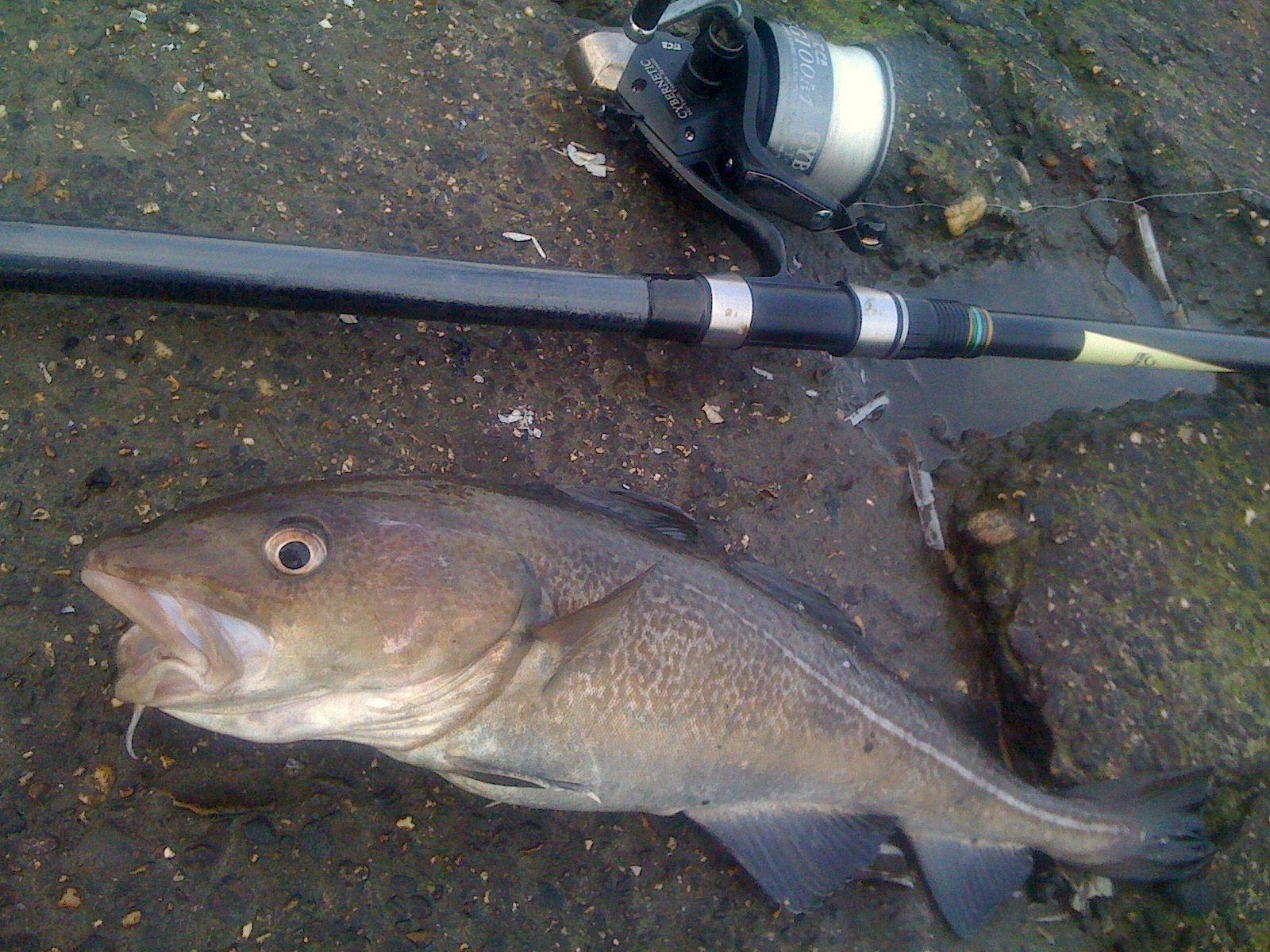 Inmiddels waren Andre en (?, komt nog wel..) bij ons aangeschoven. Vier vissers op een rij en het werd allemaal wat serieuzer. Zich vastzwemmend vissen, mannen afdalend over de gladde blokken naar de waterlijn om een vis te pakken, hengels die uit steunen getrokken werden.