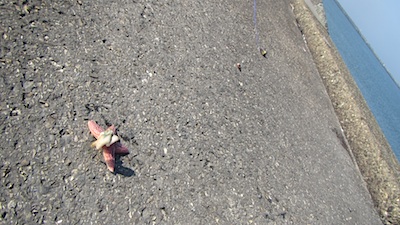 Deze hengel heeft dus met een paternostertje ook een uurtje meegedaan met de bottenjacht, maar leverde geen vis op. Toen de vloedstroom er goed in kwam, moest de gullenhengel weer aan de bak onder de kant. Bij de buren werden namelijk gulletjes gevangen. En rond half twee was het zover, de eerste aanbeet (en helaas ook enige van deze middag) bracht me een gulletje van iets over de dertig centimeter.