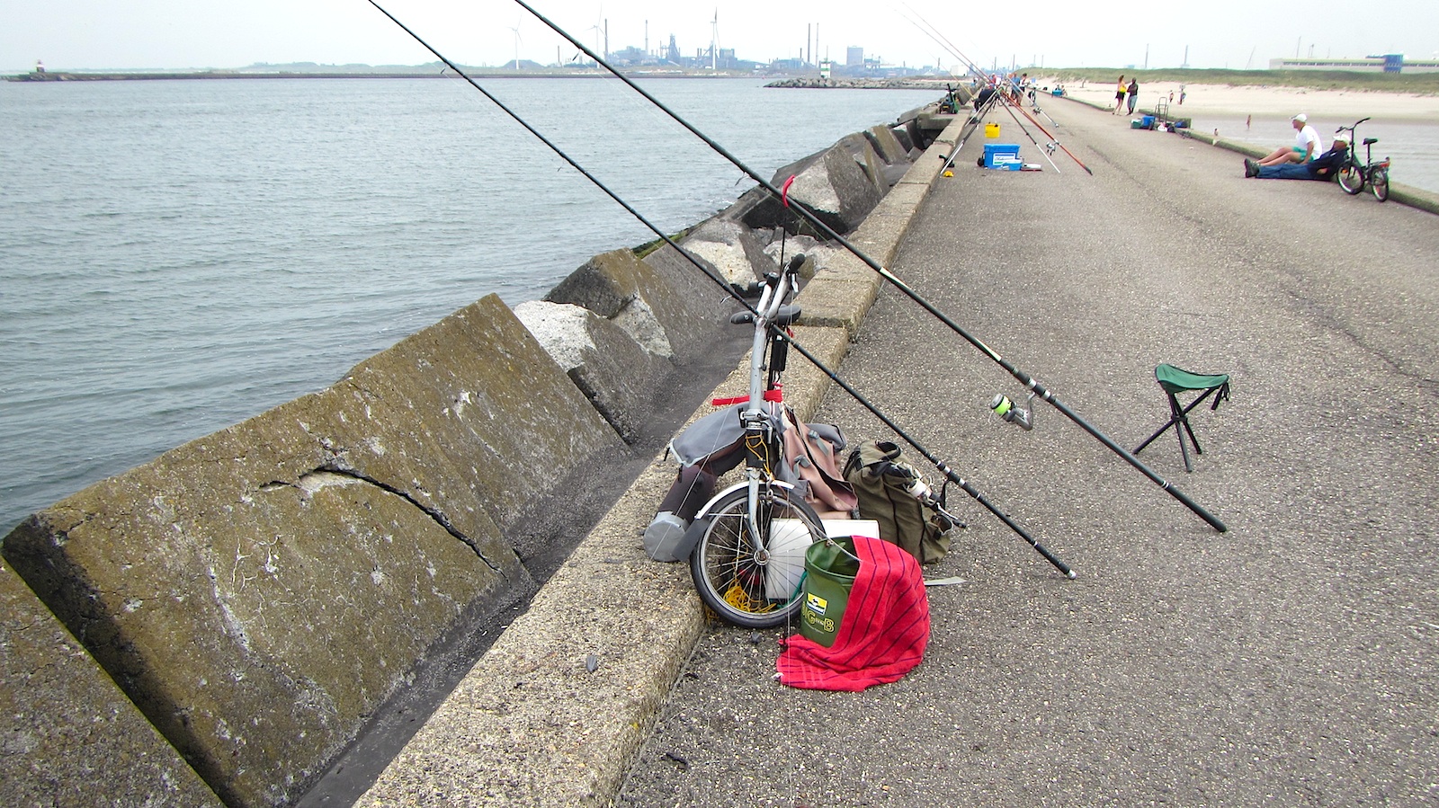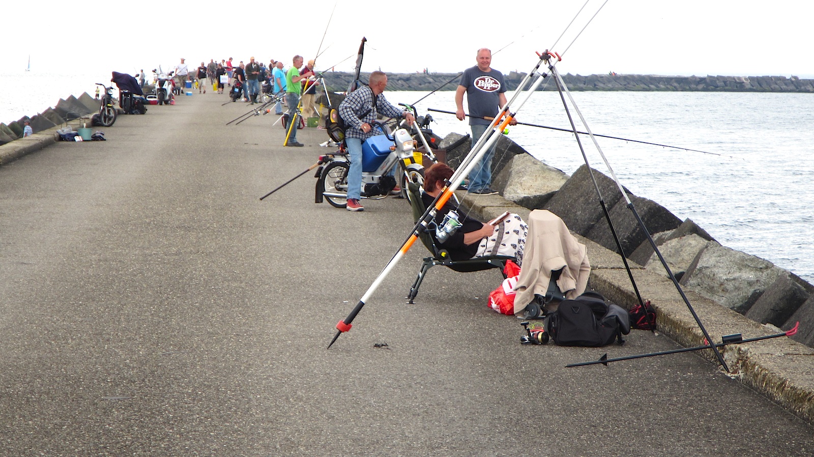 Tijdens de druk bezochte wedstrijd koos ik voor de strandhengel met drie kleine haken, metalen afhoudertjes, piertjes als aas. De karperhengel viste ik met twee lange wapperlijnen met drijvertjes er op, zagers aan de iets grotere haken. Het idee was hier slepend mee te gaan vissen op zeebaars of makreel.