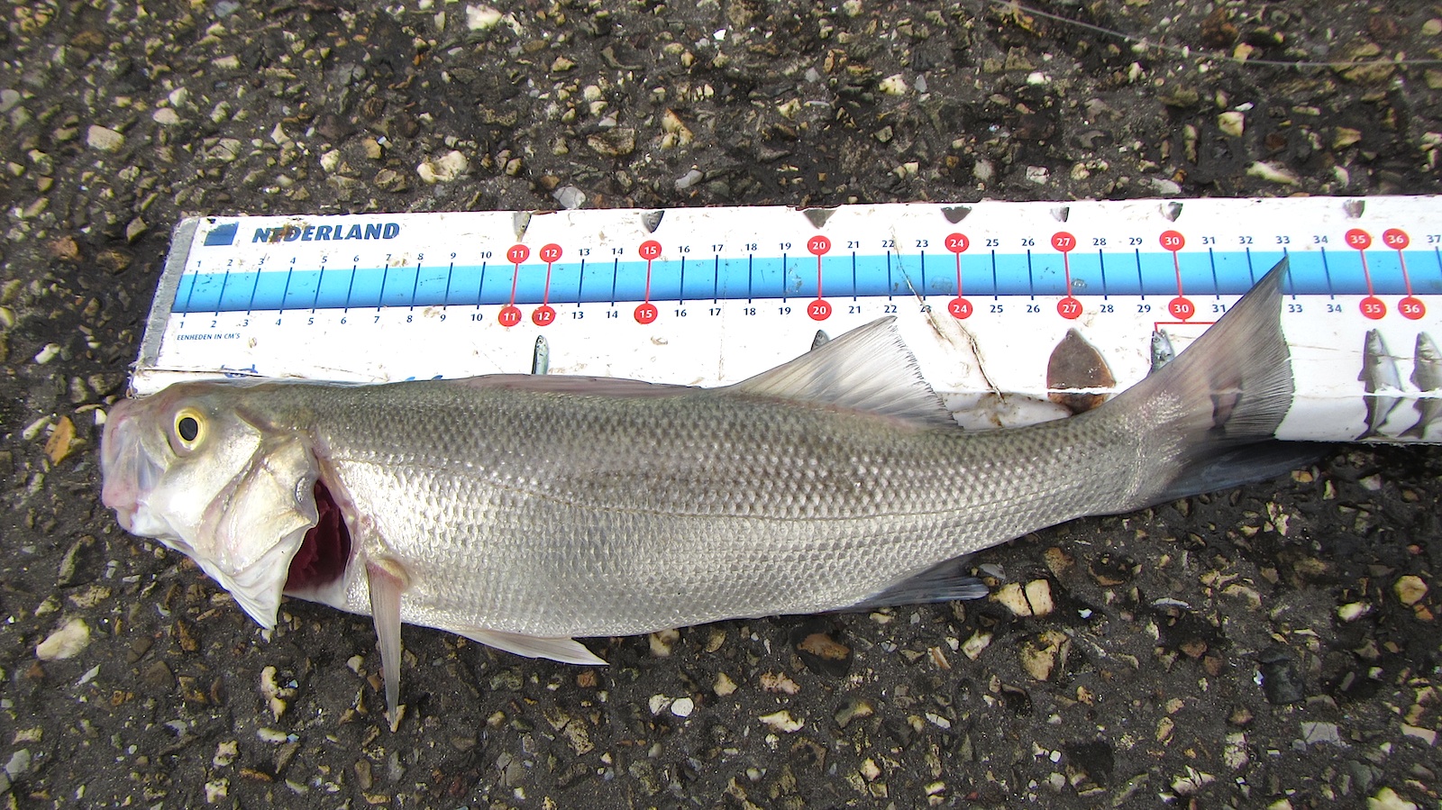 Wat er wel kwam was een mooie aanbeet die de karperhengel deed stuiteren. En daar was het zeebaarsje (35 centimeter). Snel gooide ik weer in en natuurlijk hopend op meer, babbelden we nog even voort. De pieren van de strandhengel met paternoster bleven onaangetast. Het slepend vissen liet ik maar even voor wat het was.
