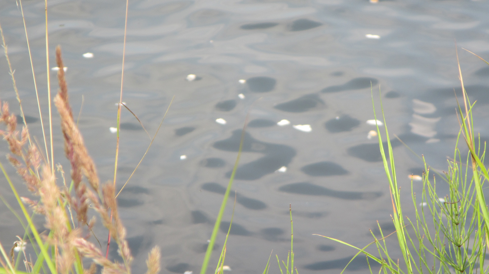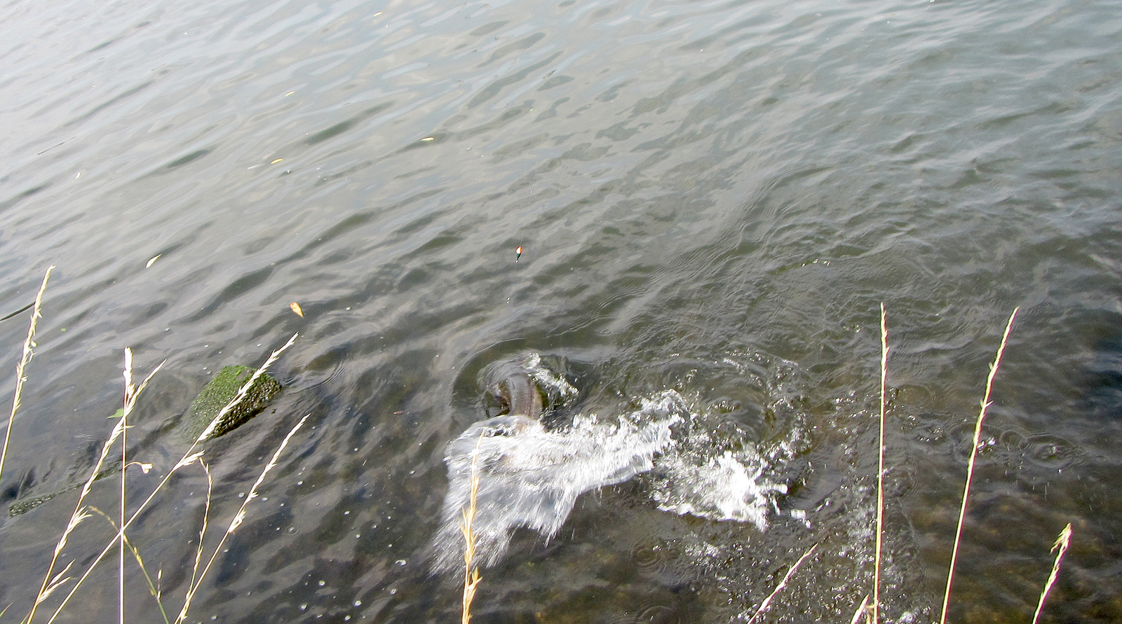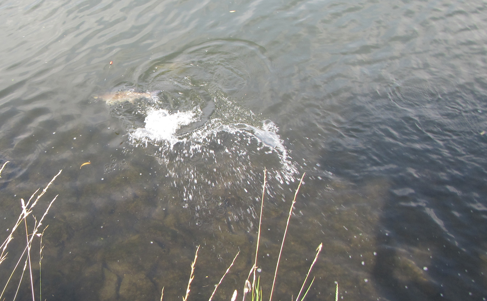 Na een half uur zag ik uit m’n ooghoek een grote staartvin. “Goed, ze zijn er en ik heb ze nog niet bang gemaakt”, dacht ik van achter de hoge grassprieten. Om de paar minuten gingen er een paar korstjes en brokjes grondvoer te water. En vol spanning volgde ik het vlokdobbertje er tussen.