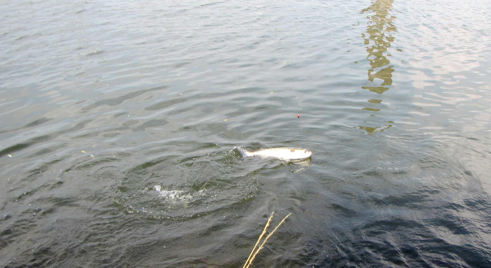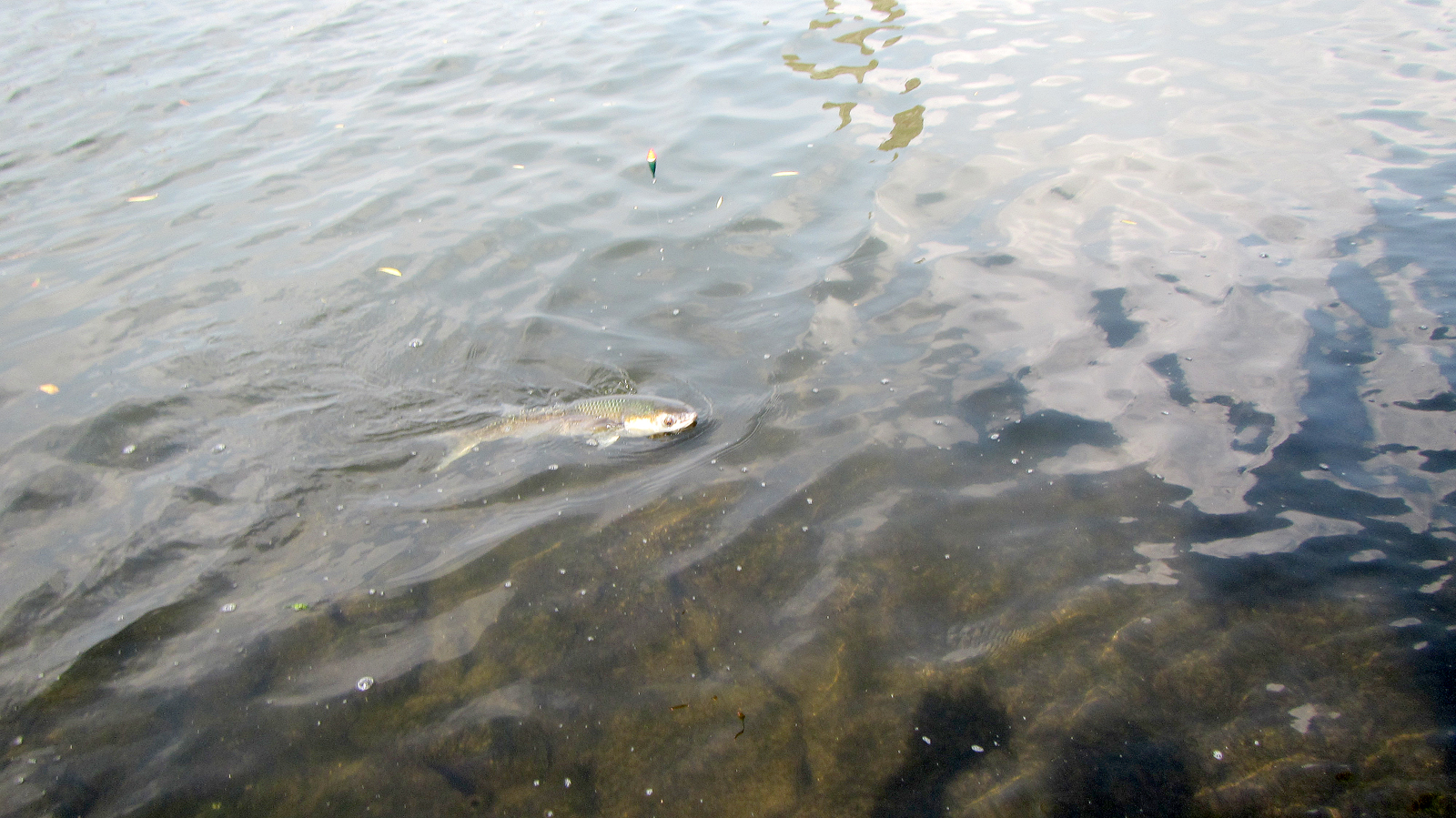 De opwinding steeg toen de harders na een kwartiertje naar de korsten begonnen te happen. Niet alleen dicht bij de kant, maar ook verder uit de oever. Door de loodverdeling wat te veranderen liet ik een korstje aan de haak hier tussen meedrijven.