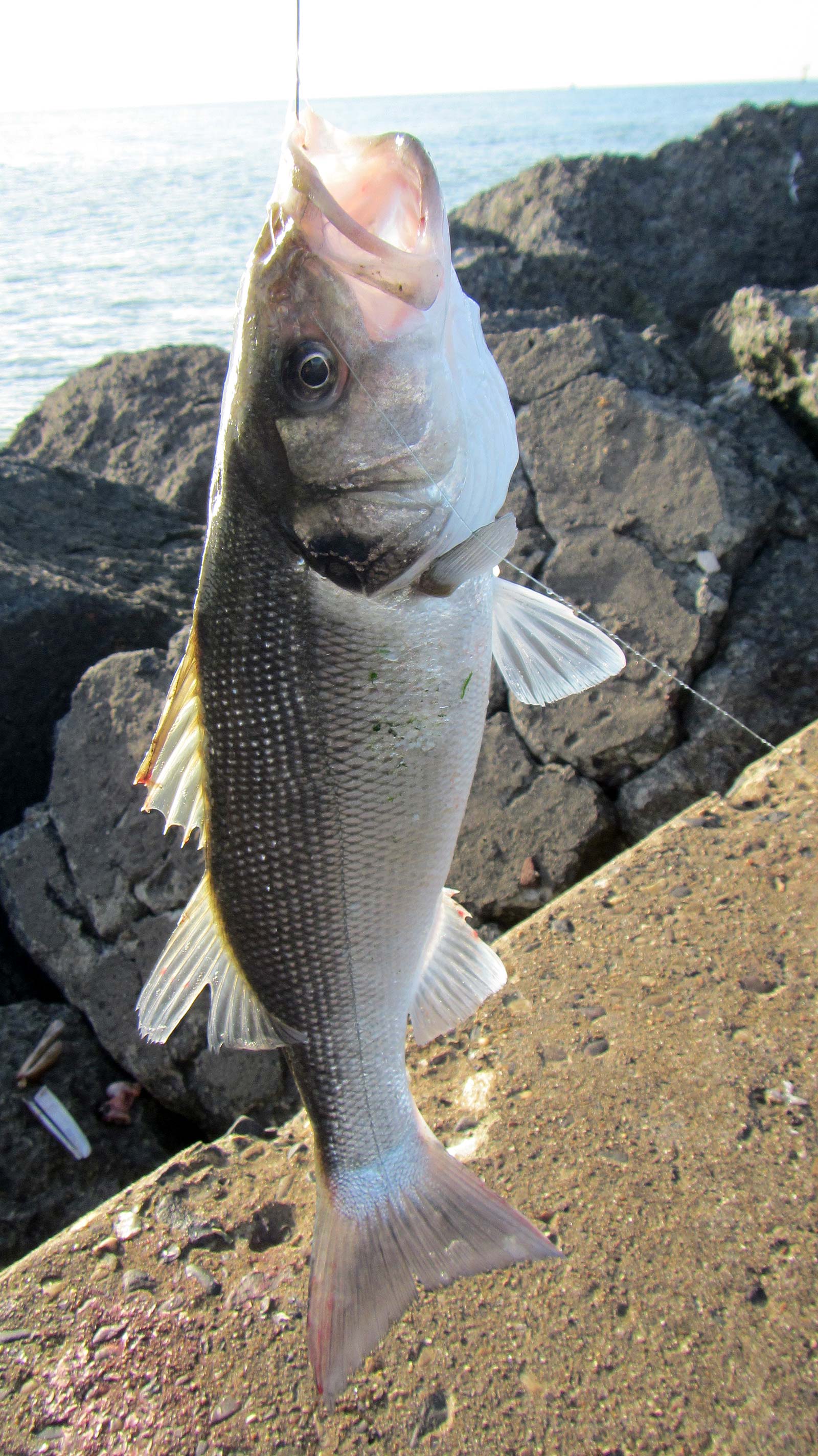 Na wat stoeien kwam er een mooie…zeebaars -even boven de 40 centimeter- boven. Altijd welkom! De mesheft was grotendeels weg, maar ik weet niet of de baars dat zelf had gedaan, dat hij slechts reageerde op een voorbij flitsend wit sliertje óf op het kleine visje dat de flauwe tikjes had veroorzaakt.