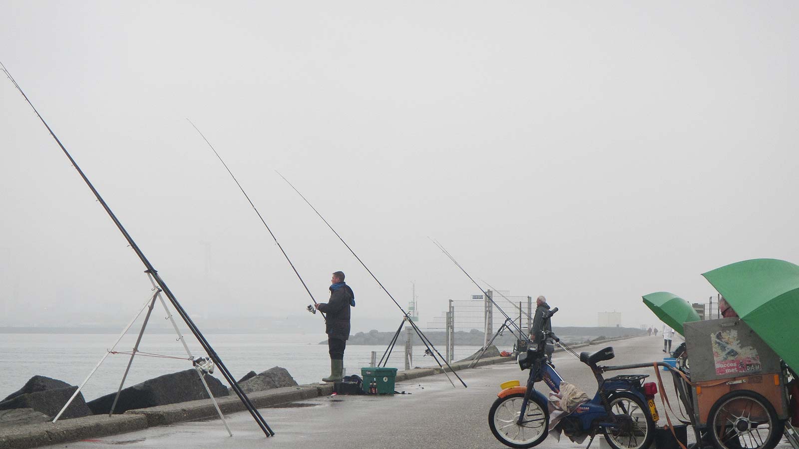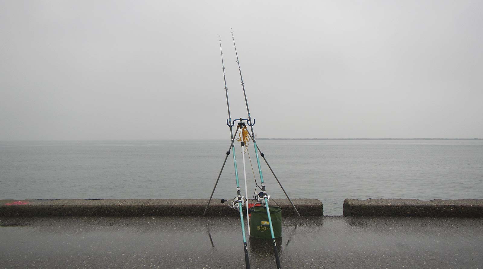 De weersvoorspellingen (hele dag regen) blijken mee te vallen: er staat weinig zuidelijke wind en er komt lichte tot zware motregen voorbij. We vissen met afgaand water (hw 9:13 uur) tot 15:00 uur.