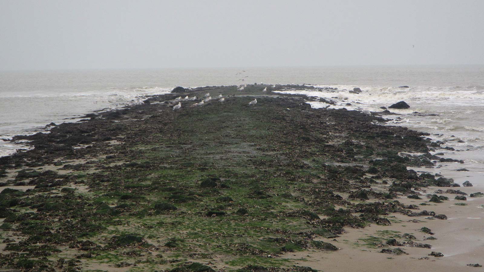 Bij laag water rond 10:00 uur eerst even kijken hoe het er uit ziet. De strekdammen liggen boven water. Ze zijn prima begaanbaar en gevuld met meeuwen. Voor de kop zwemt een grijze zeehond. Er moet hier dus wat te halen zijn.
