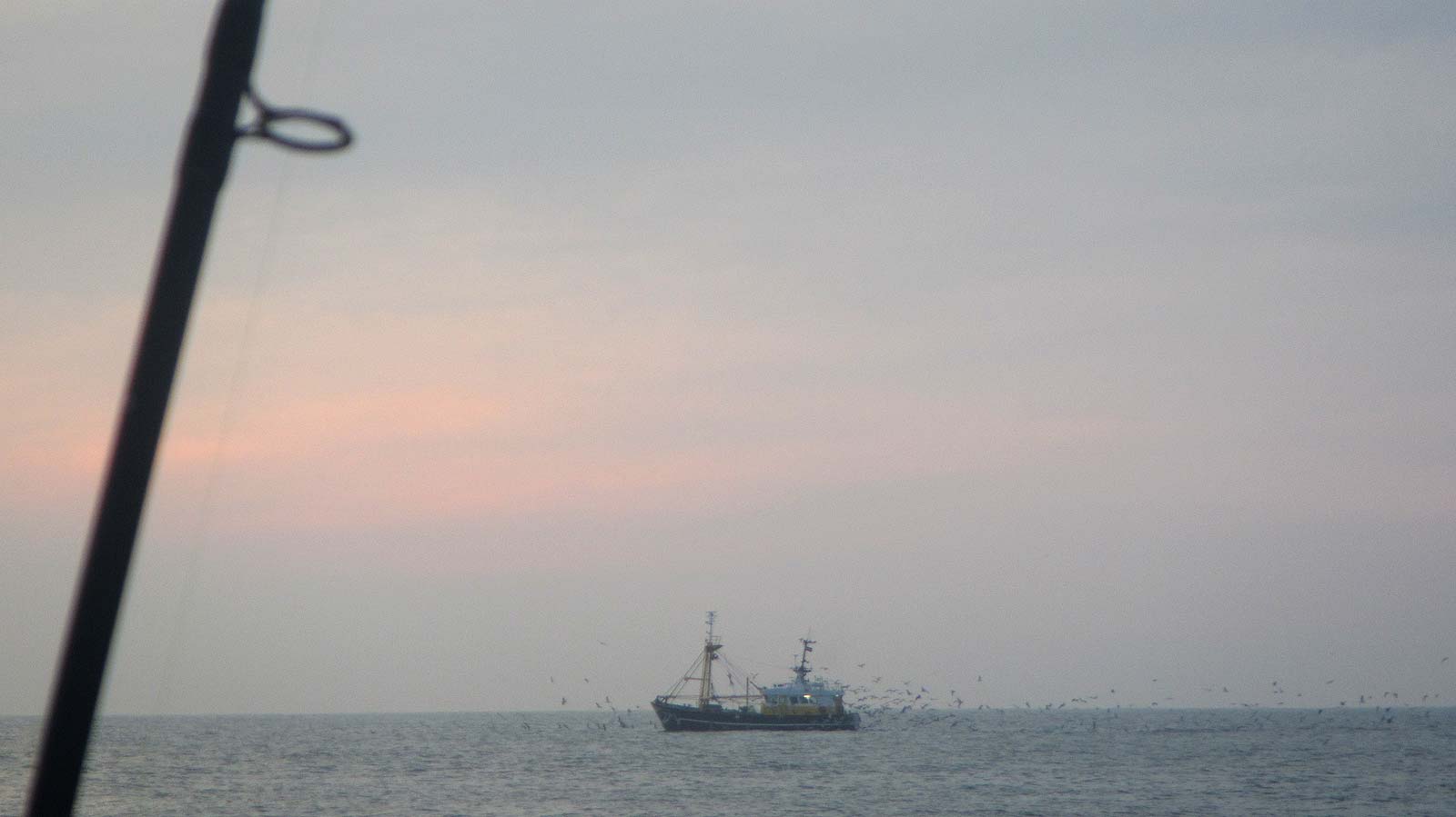 De vissersboot heeft meer succes gehad, gezien vele meeuwen in de achtervolging.