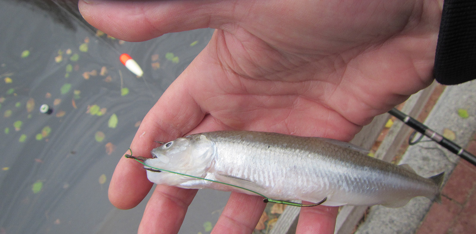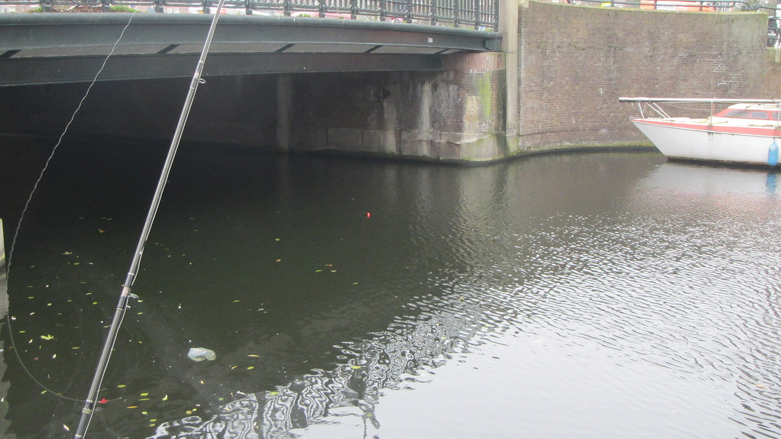Ik heb de diepte goed uitgepeild zodat de aasvis vlak boven de bodem zweeft. Grote schepen uit het kanaal verderop geven af en toe een mooie trek. Ook de wind helpt mee de dobber te verplaatsen. Om het kwartier gooi ik opnieuw in, de spiering blijft mooi ruiken en blijft ook onaangetast.