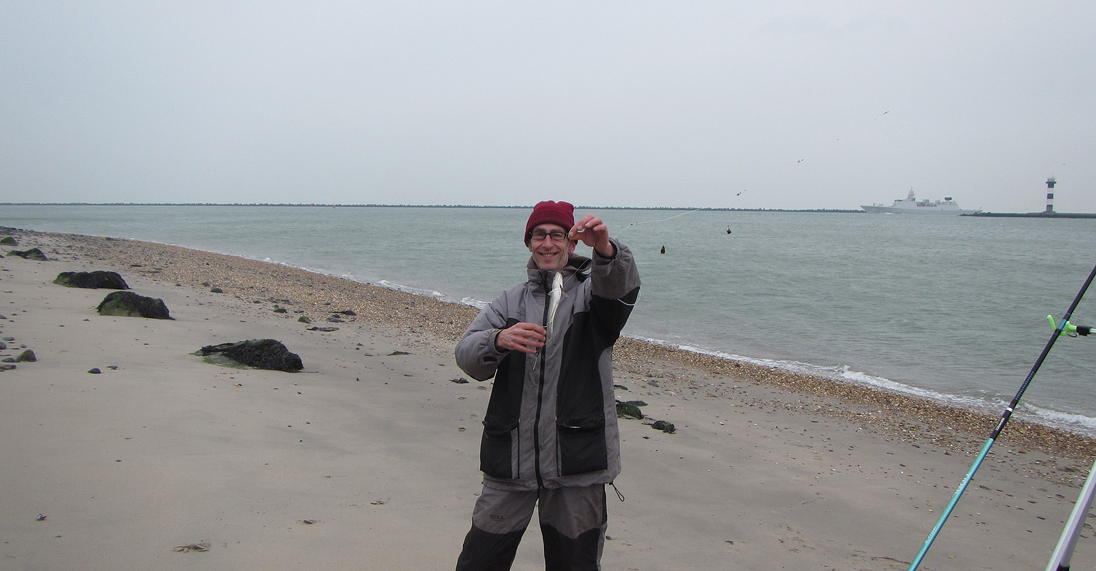 Met paternostertjes met kleine haakjes hebben we hier schar en wijting als doel. Allebei één hengel, gewoon relaxed vissen. De -prachtige- pieren zijn eigenlijk te groot, bestemd voor gul. We zien de buren inpakken terwijl wij staan op de tuigen. Hm, geen goed teken.