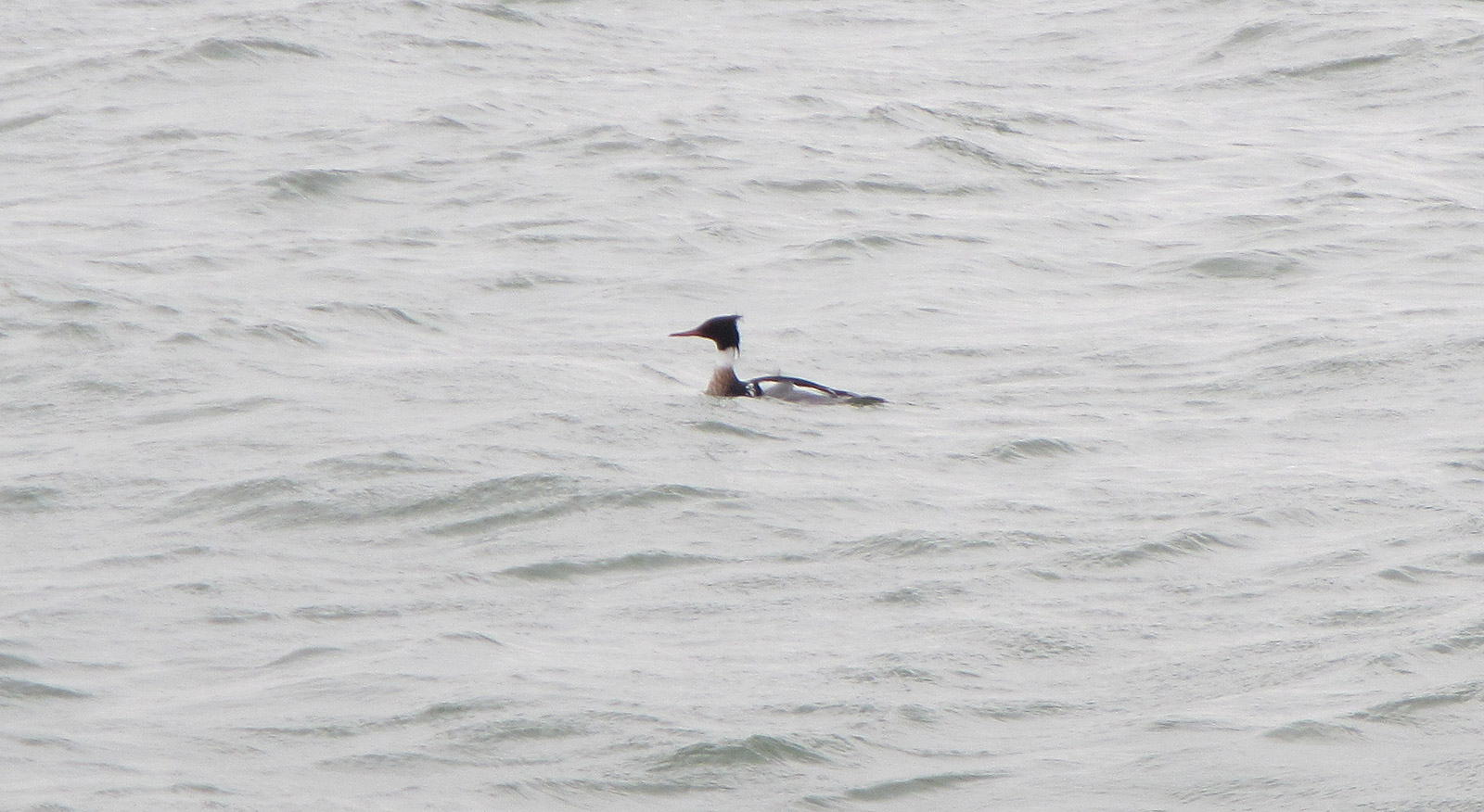 Voor onze neus bejaagt een vogel prooi onder water en duikt regelmatig op en onder. Ik heb deze soort nooit eerder gezien, maar uit diepe krochten van m’n geheugen borrelt “zaagbek” omhoog. Het internet bevestigt dit ;-).