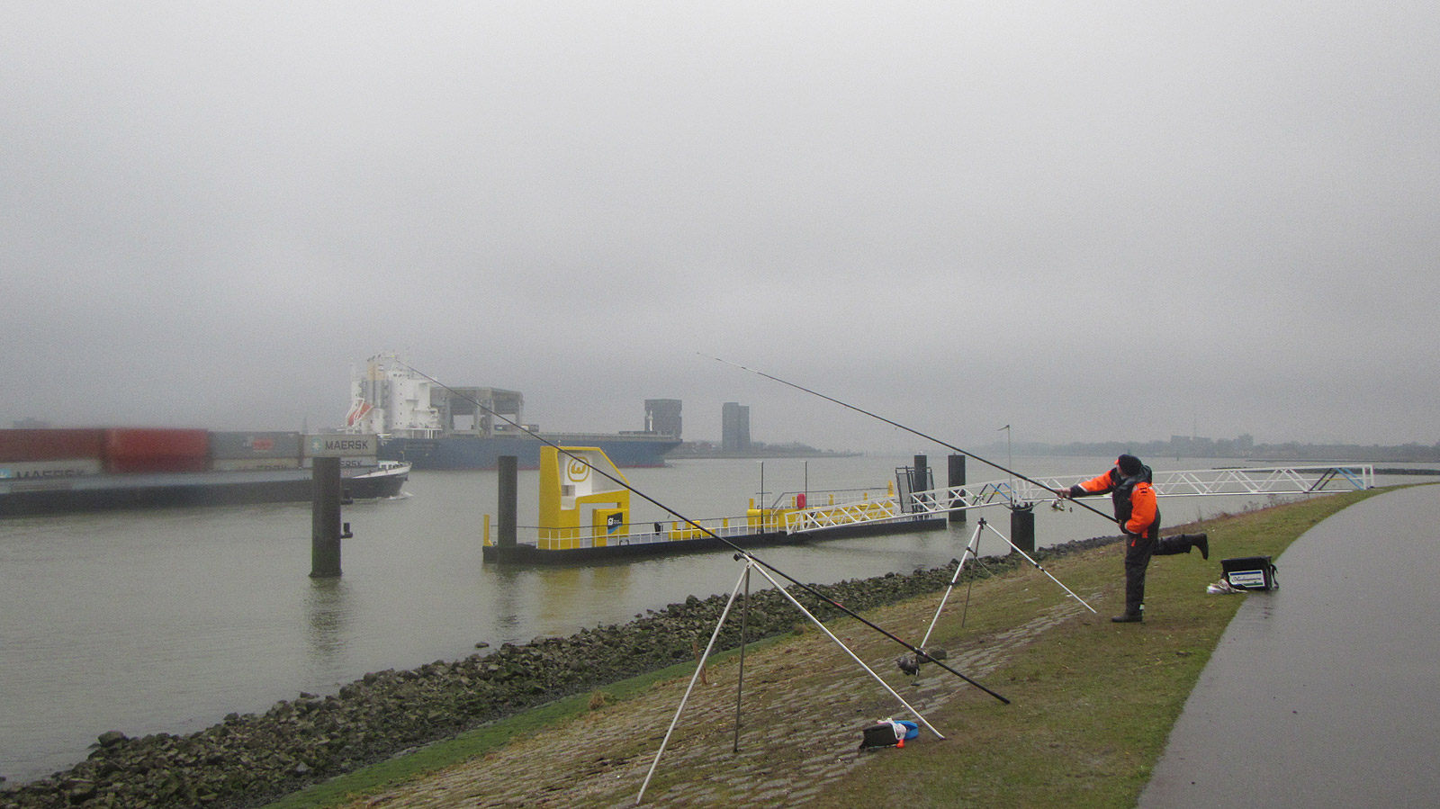 De regen blijft doorzeuren en een prettige plek waar iets leuks te vangen is, komen we verder niet tegen. Na een kop koffie in De Veerheuvel besluiten we naar de Waterweg te gaan. Waar we eerdere keren tegenover de Stena Line visten, proberen we het nu bij het Calandpark.